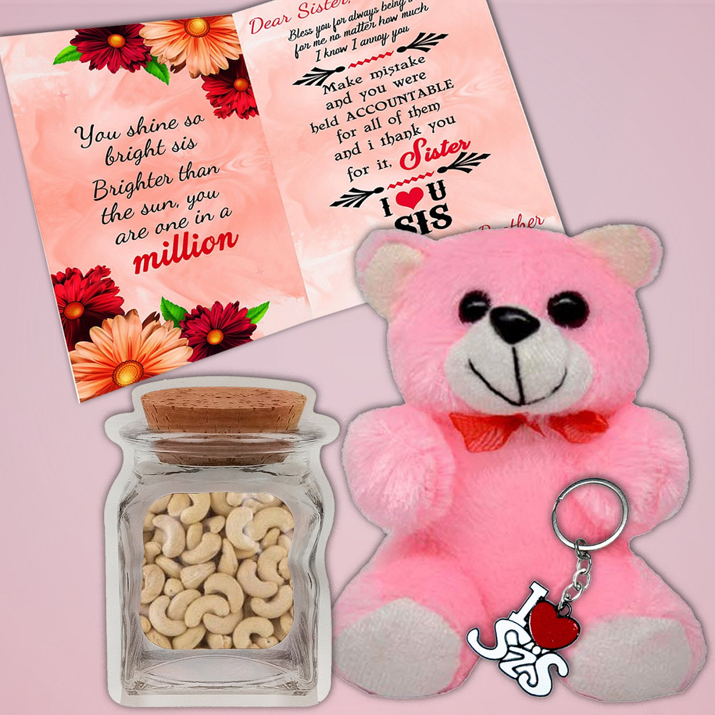 If you're looking for a unique Rakhi gift for sister that combines emotion, health, and utility, this combo is your ideal choice. The teddy brings warmth and affection, the dry fruits offer health benefits, the card expresses your love, and the keychain is both functional and stylish. This Rakhi gift for sister is perfect for those looking for a meaningful yet practical gift.