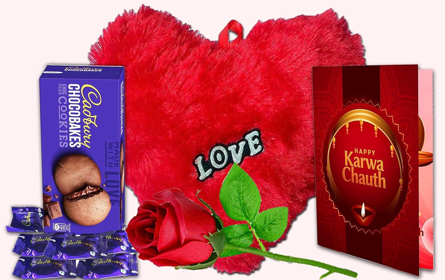 Karwa Chauth is not just a day—it’s a testament. A testament to her unwavering love, patience, and strength. It's about that one day where she puts your life and well-being above her own comforts, and fasts with devotion, grace, and endless affection. And as the moon rises and she looks at you through the sieve, her eyes full of emotion, you want to say something that’s deeper than just “I love you.” That’s where the Complete Karwa Chauth Gift Set comes in. Curated with tender care, this elegant set includes premium chocolate cookies (75gm, 6 bites) to sweeten her evening, a plush red heart that speaks without words, a thoughtfully crafted greeting card to let your emotions flow, and a single artificial rose that remains beautiful, just like her love — timeless and ever-lasting.