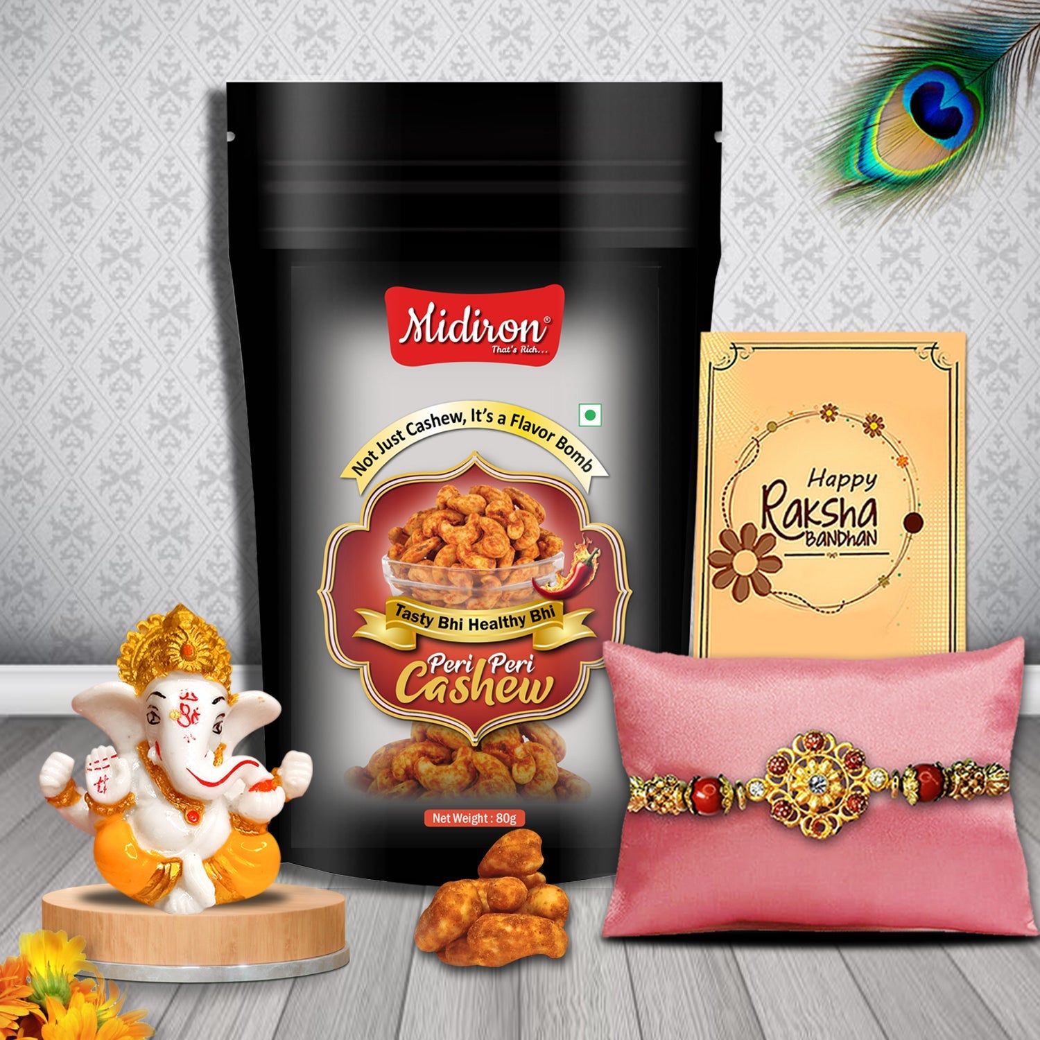 Whether you're tying the rakhi in person or sending your love from afar, this gift hamper is designed to express everything your heart holds. Combining the warmth of tradition, the flavor of togetherness, and a sprinkle of divine blessings, this set includes spicy peri peri cashews, a blessing-filled Ganesh idol, a handcrafted designer rakhi with roli chawal, and a heartfelt greeting card.