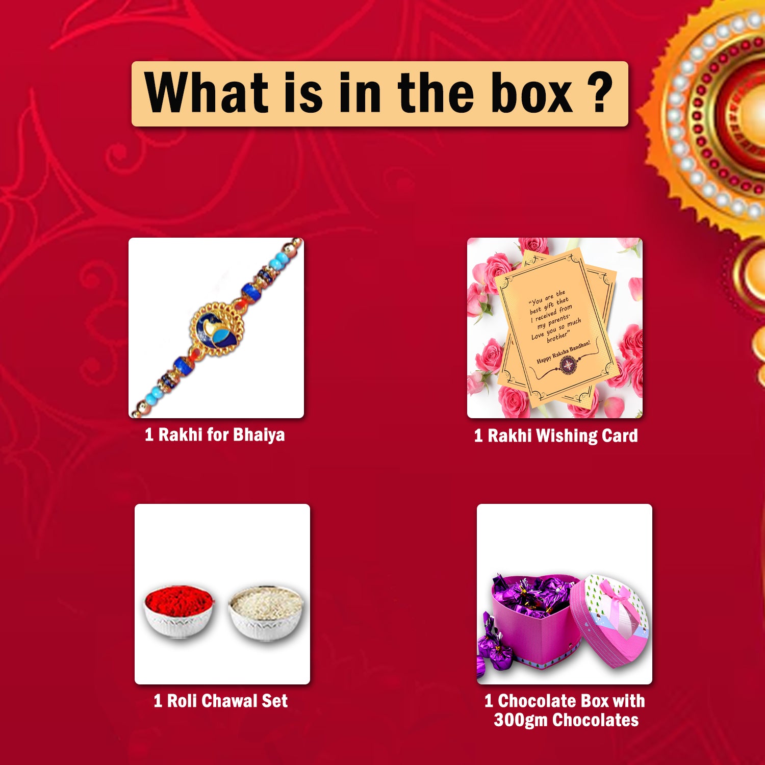 If you're unable to celebrate Rakhi in person, this combo makes it easy to send your love across cities or states. Every component in this Raksha Bandhan combo is handpicked to ensure your brother feels cherished and remembered, even from miles away. The elegant Rakhi, sweet chocolates, and traditional essentials combine to create a festive experience that feels just as warm and heartfelt as an in-person celebration.