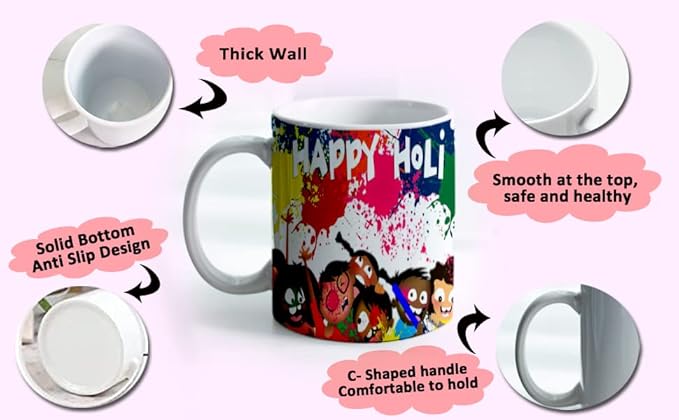 - The mug is a cheerful and functional gift for enjoying hot drinks during the festivities—an essential in any Holi gift set.
