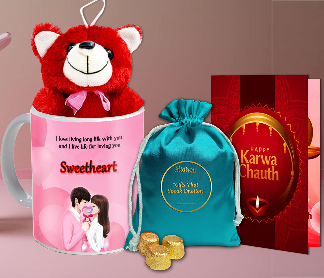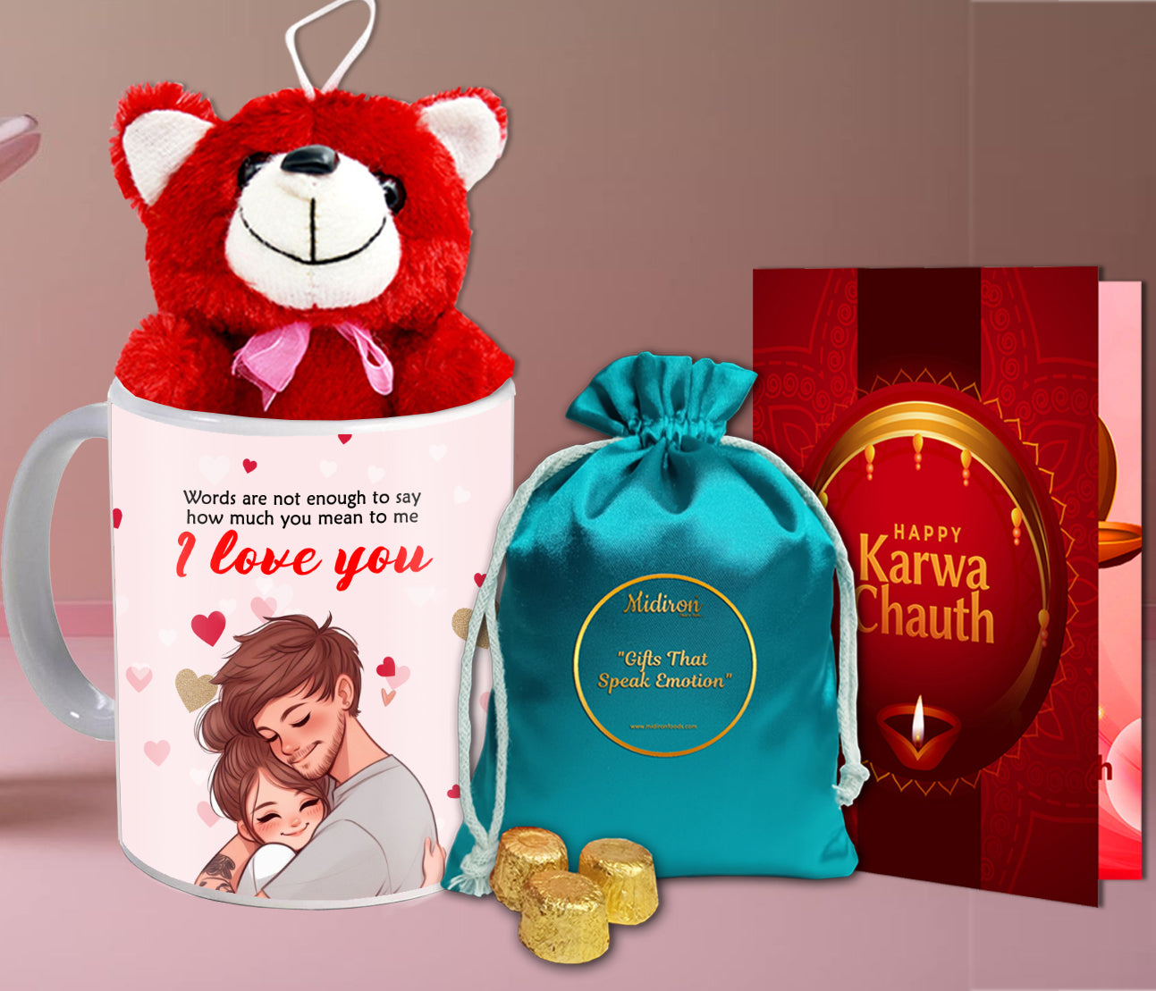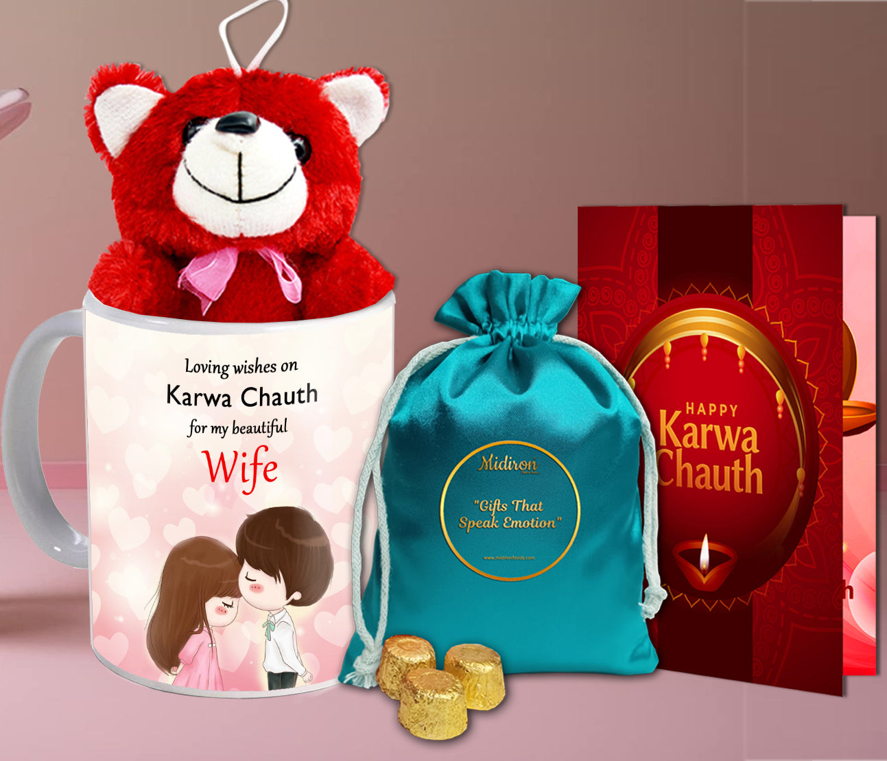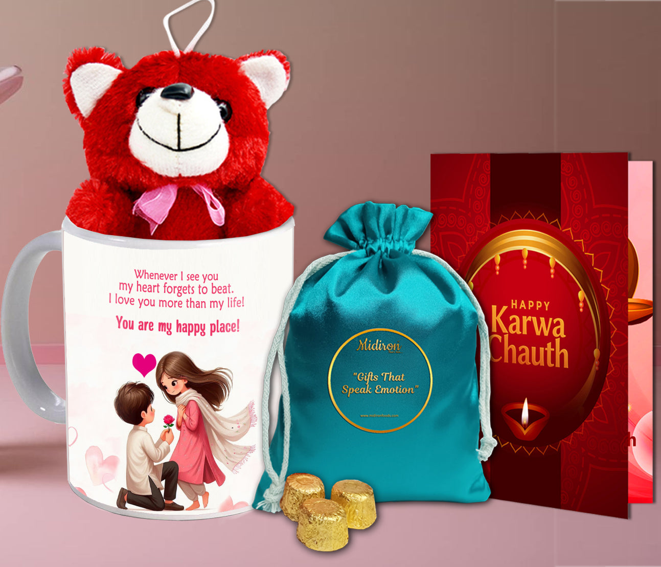 This Karwa Chauth, go beyond the usual and gift something that reflects emotions and memories. Let the Chocolate Thali bring sweetness to the moment. Let the Red Teddy offer a warm hug even when you're away. Let the Printed Mug keep your love close in every sip. And let the Karwa Chauth Card speak the words your heart holds dear.