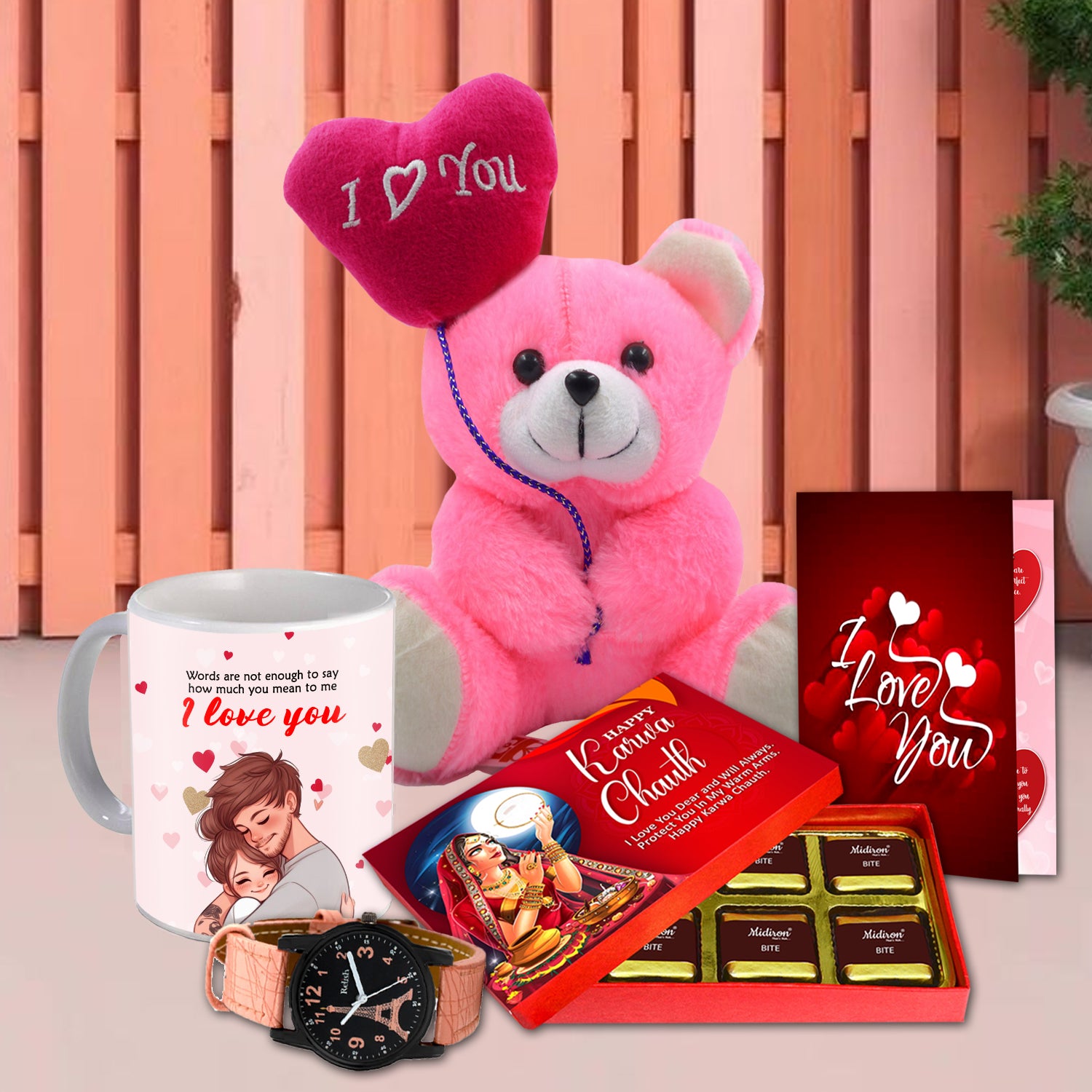 Karwa Chauth is a celebration of deep devotion, enduring love, and heartfelt promises. Whether you're newly married or have been together for years, this occasion is a special opportunity to express how much you value your partner. This thoughtfully curated Karwa Chauth gift set—featuring a Chocolate Box, Printed Coffee Mug, Teddy, Watch, and a Romantic Karwa Chauth Card—makes for a perfect gesture of love, affection, and festive spirit.