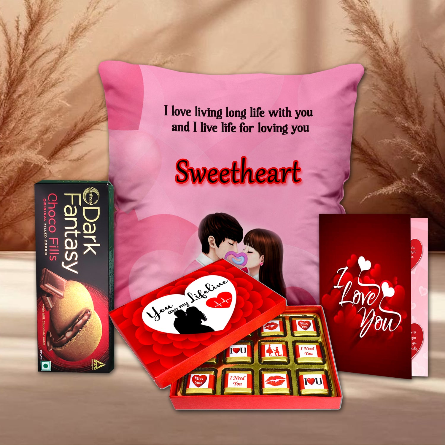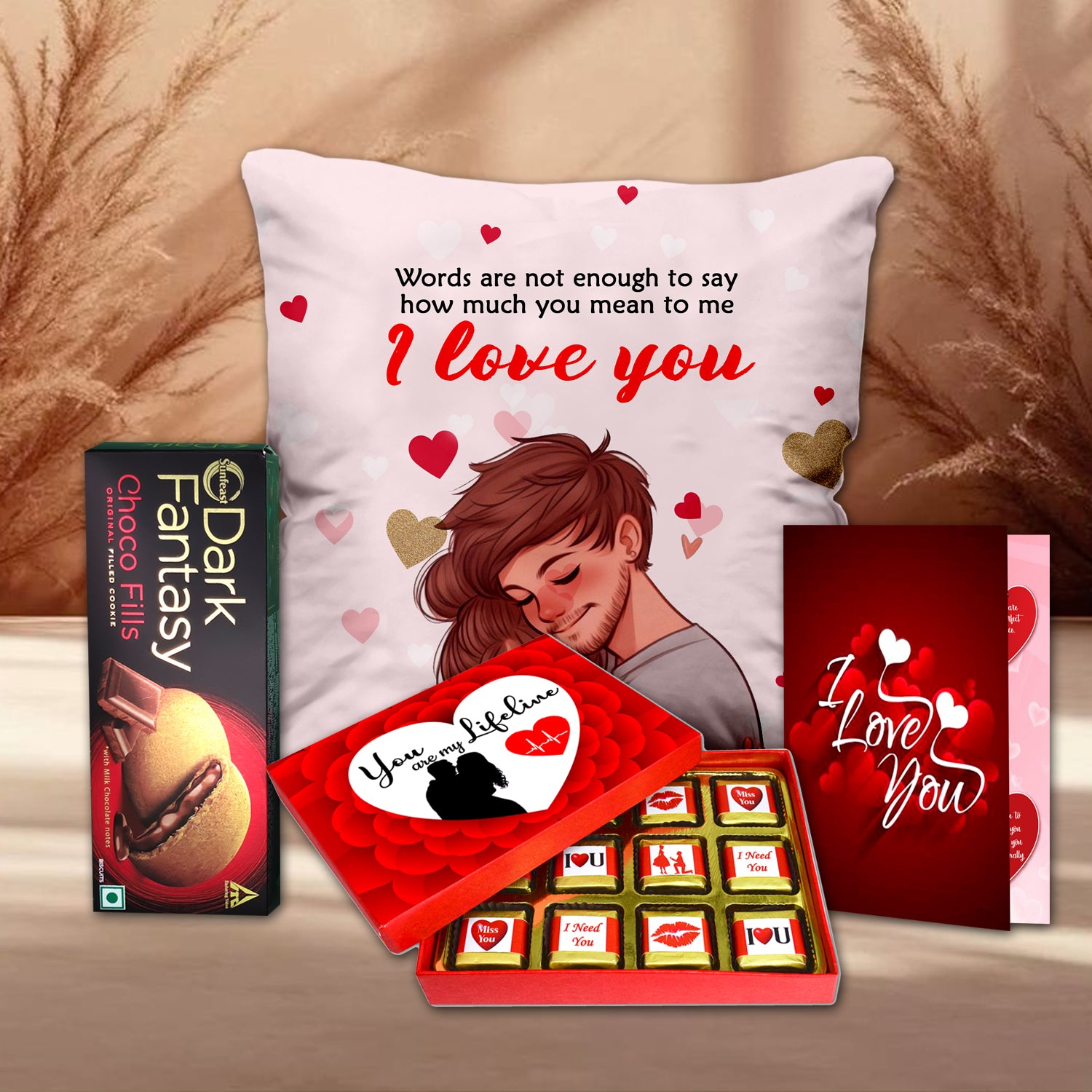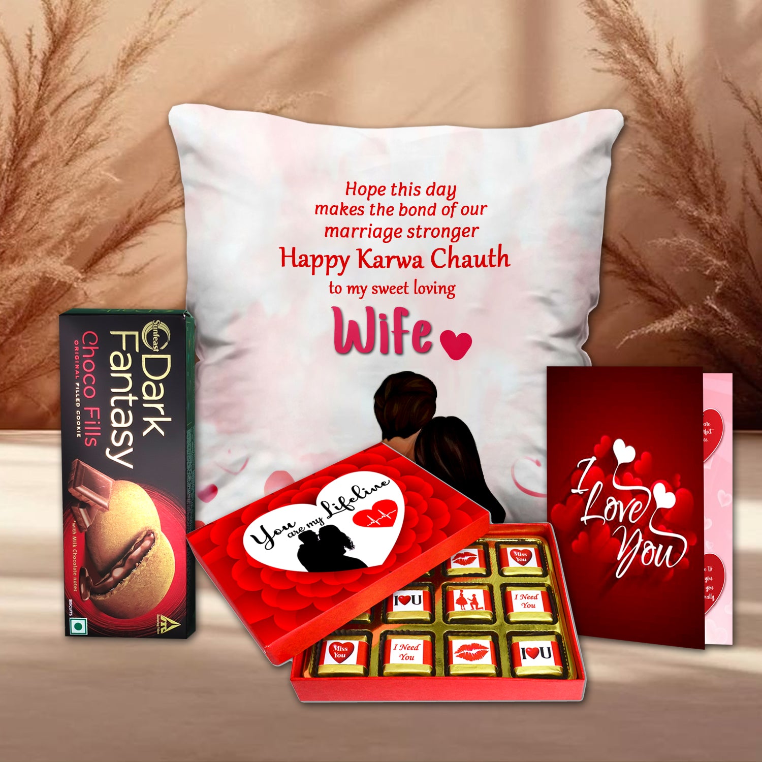 This Karwa Chauth, show your love with a thoughtfully curated combo that brings together emotion, indulgence, and personal touch – a soft cushion, a tempting chocolate box, rich chocolate cookies, and a printed card with heartfelt words. Ideal for expressing affection, this gift set offers a complete celebration experience for your wife. Whether it's her first Karwa Chauth or your tenth together, this combo promises to make the moment unforgettable with sweetness, comfort, and love.