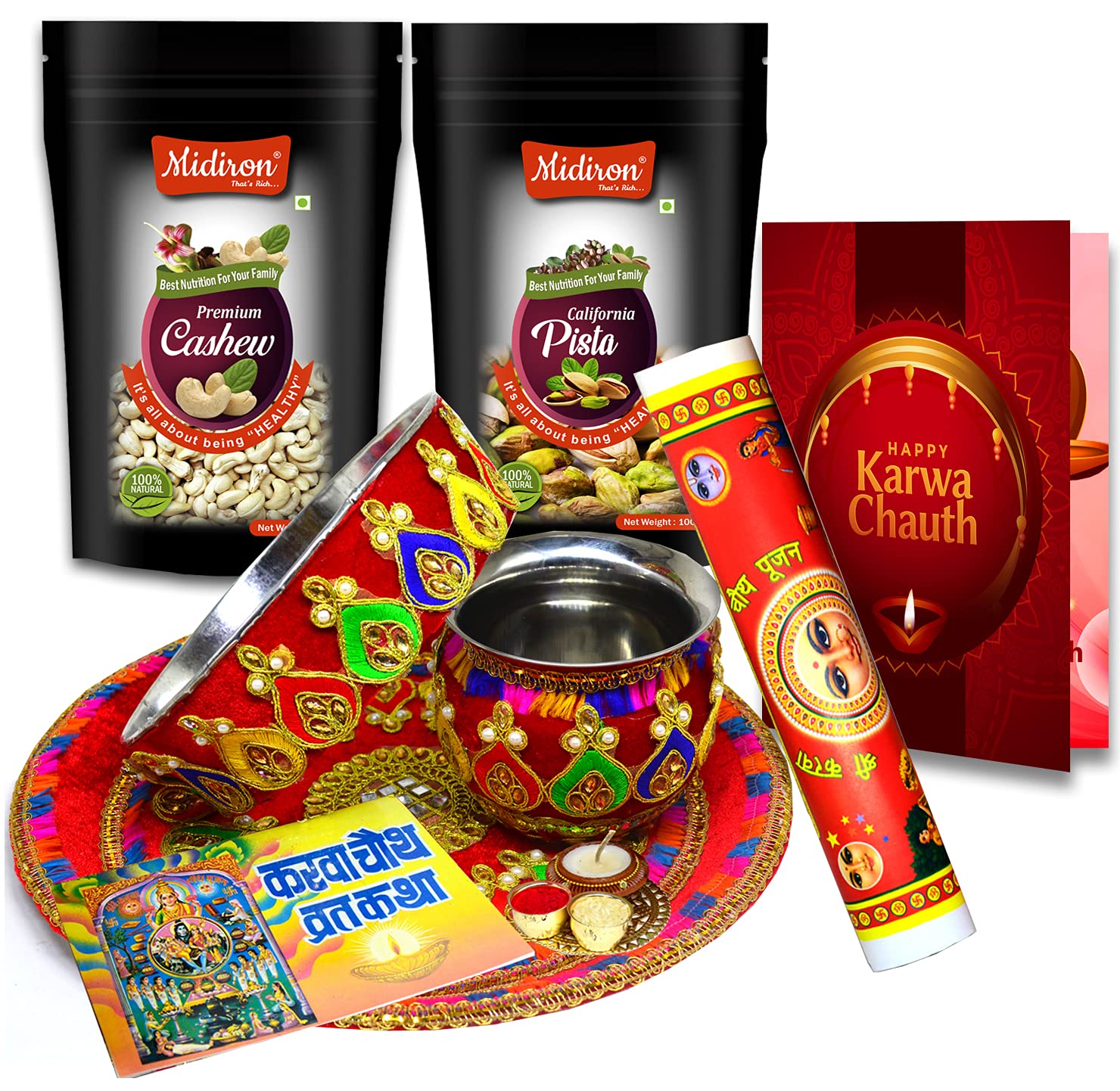 Mark the sacred day of Karwa Chauth with this all-in-one festive combo curated to honour devotion and tradition. This beautiful Puja Thali Set with Cashew and Pista is designed to support every step of the Karwa Chauth vrat, from early morning sargi to the evening moon sighting rituals. With premium dry fruits and a heartfelt greeting card, this is more than just a gift—it's a celebration of love and spiritual connection.