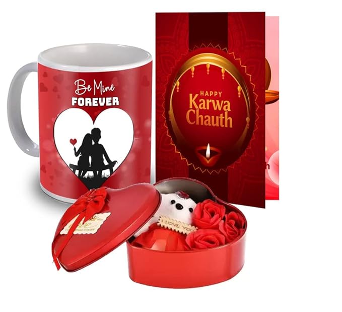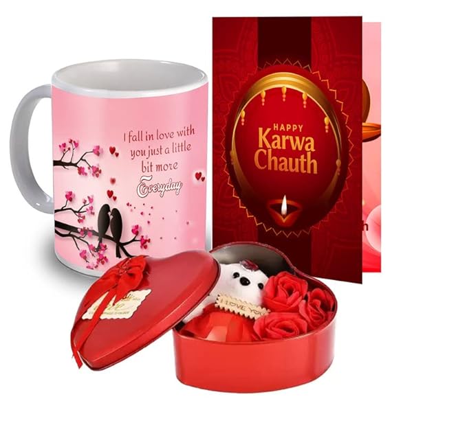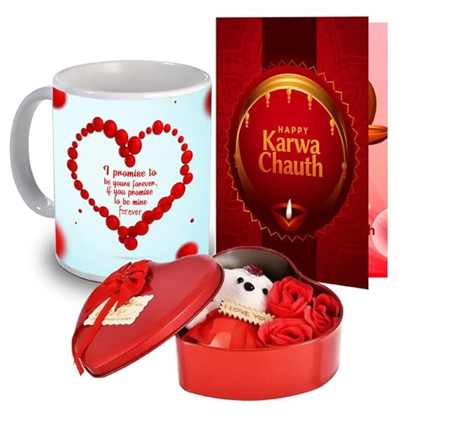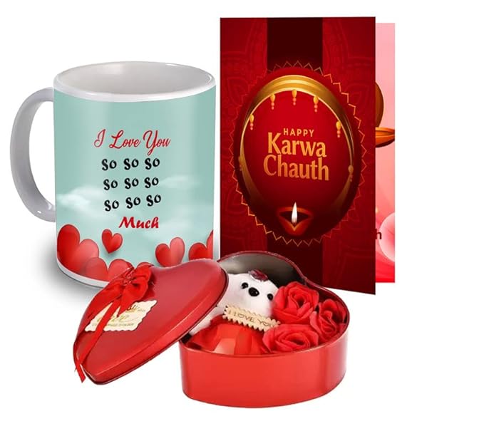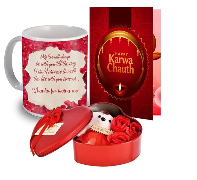 Karwa Chauth is more than a festival—it’s a heartfelt celebration of love, devotion, and enduring togetherness. It’s a day when hearts beat in unison, when the moon is awaited not just as a celestial body but as a symbol of everlasting bonds. As your beloved observes the fast with prayers for your long life and happiness, the least you can do is surprise her with a gift that reflects the same love, effort, and intention. This Karwa Chauth Gift Set, thoughtfully curated with a designer printed coffee mug, a cute tin teddy box, and a Karwa Chauth greeting card, is the perfect way to say, “I see you. I cherish you. I’m grateful for you.” Each element of this hamper is chosen to create an emotional moment that she’ll remember long after the festival is over.