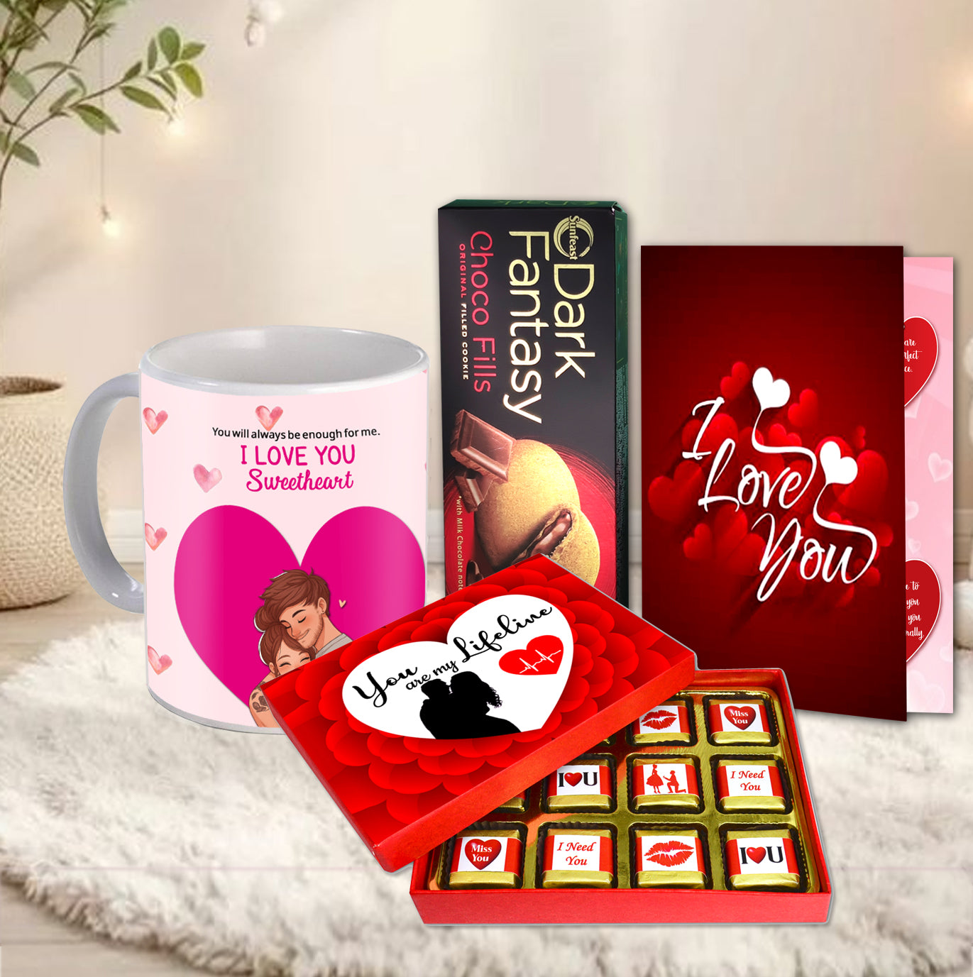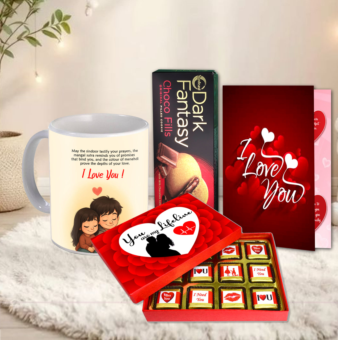 Celebrate this Karwa Chauth by gifting your wife a heartwarming combo that blends emotion, sweetness, and utility. This specially curated gift set includes a lovely mug, a rich chocolate box, crunchy chocolate cookies, and a beautifully designed printed card—a complete surprise that turns the fast-breaking moment into a cherished memory. Designed as a perfect Karwa Chauth gift from husband to wife, this combo delivers love in every element.