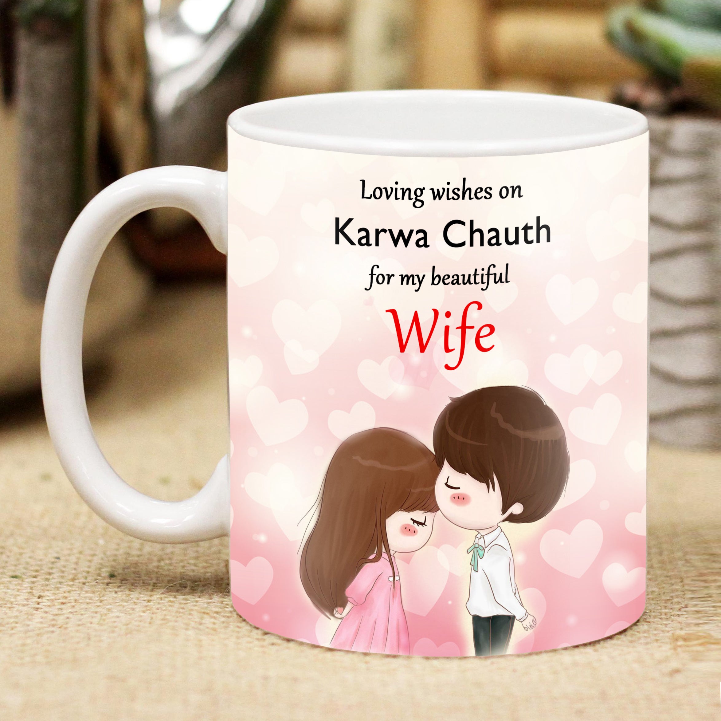 Ceramic is the ideal material for mugs due to its ability to retain heat and resist stains. This ceramic mug for Karwa Chauth not only ensures a rich drinking experience but also stays intact even with regular washing. The finish is smooth and glossy, giving it an upscale feel without compromising on practicality. It's safe, eco-friendly, and built to last.