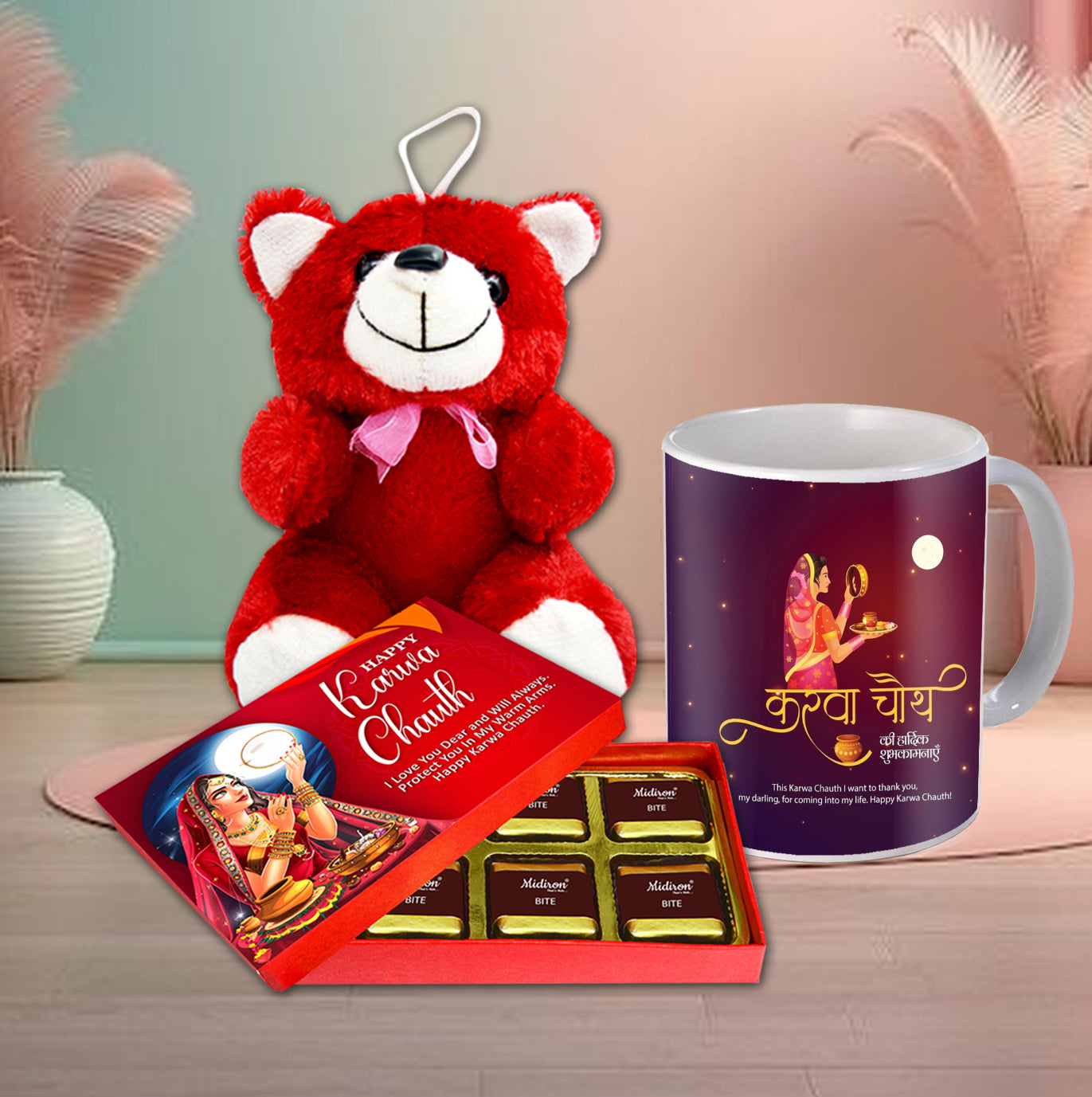 Make this Karwa Chauth unforgettable with a charming gift combo that speaks the language of love. Featuring a delightful red teddy, a stylish printed coffee mug, and a delicious chocolate box, this set is designed to make your wife feel truly cherished. Every element in this combo represents the warmth, sweetness, and devotion that define this special festival.