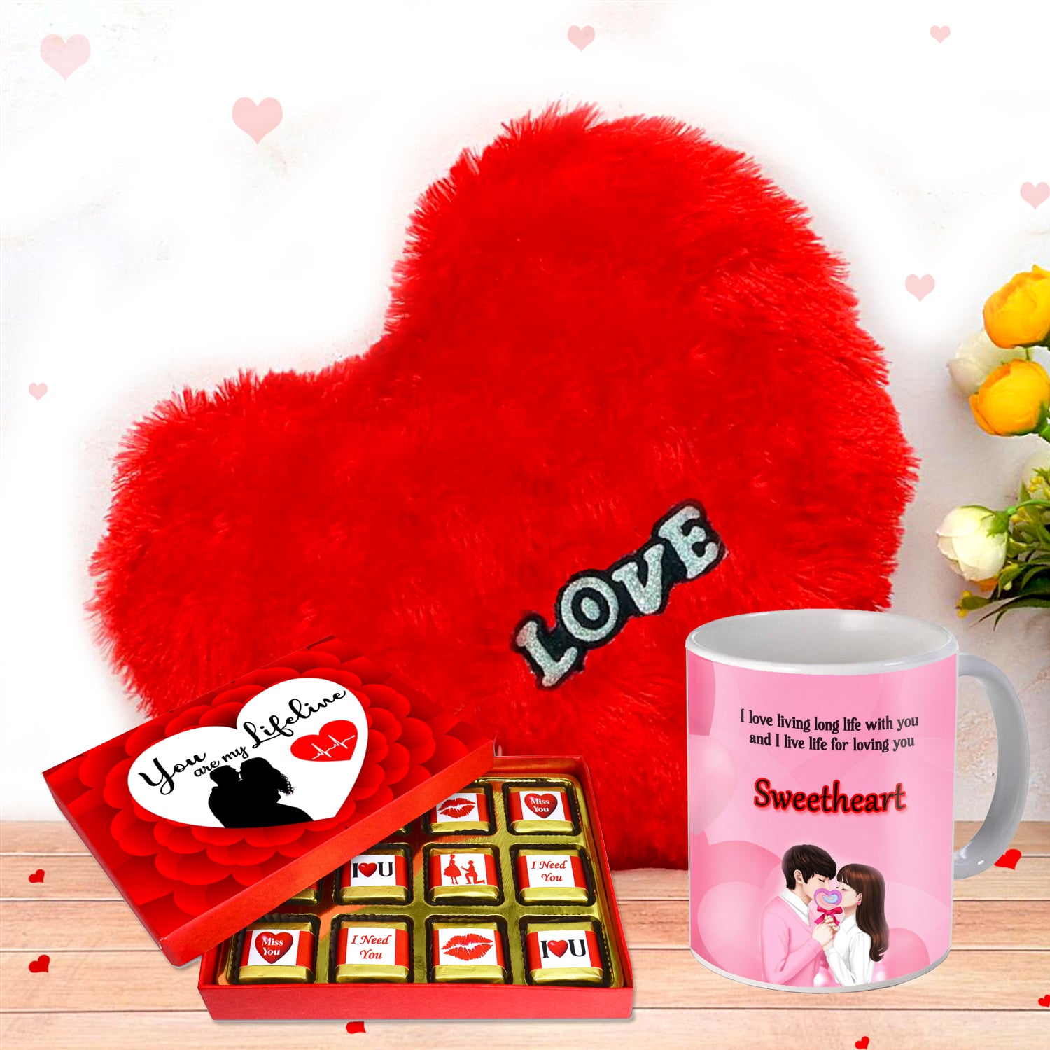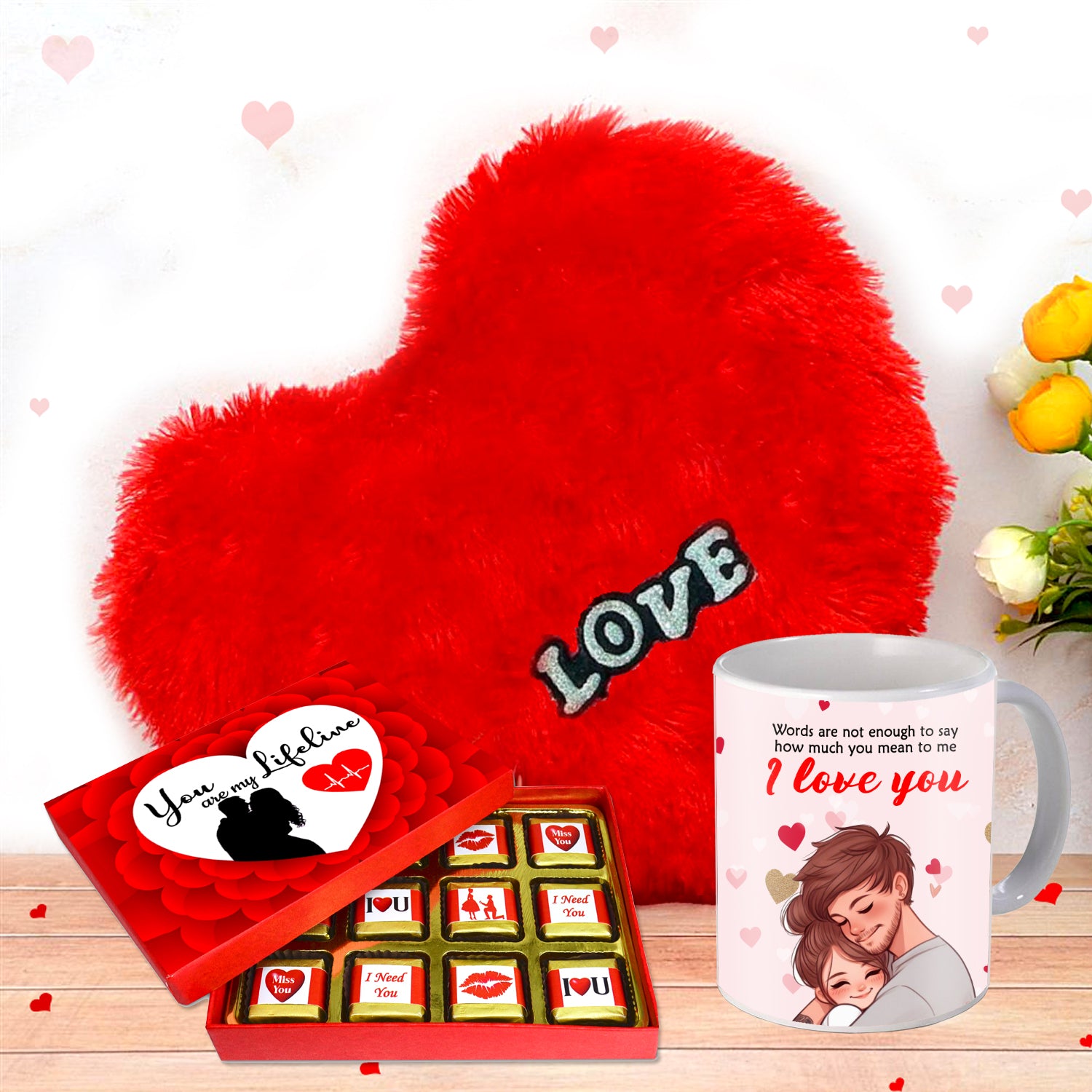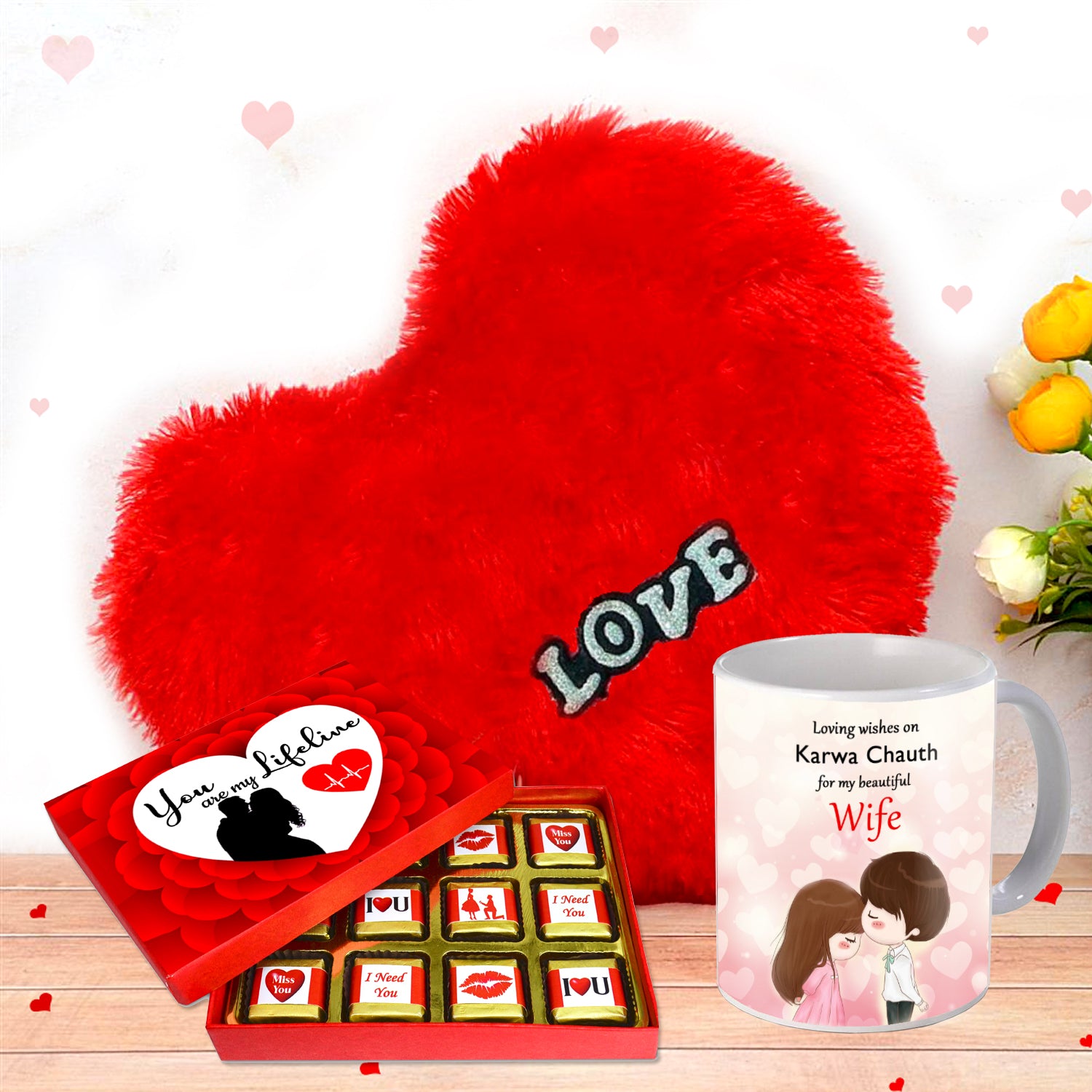 This Karwa Chauth, elevate your romantic gesture with a gift combo that expresses love in the most heart-touching way. Featuring a plush Big Red Heart cushion, a rich chocolate box, and a charming printed coffee mug, this set is crafted to melt her heart and sweeten your bond. Perfect for husbands looking to surprise their wives with something deeply emotional and delightfully indulgent.
