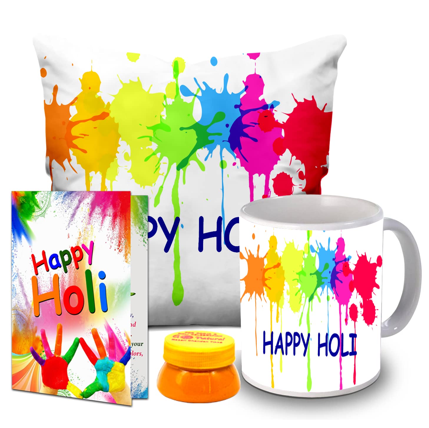 Celebrate Holi with love, laughter, and vibrant colors! The Printed Cushion, Printed Coffee Mug, Greeting Card & Chandan Tilak gift set is the perfect way to share warmth, happiness, and festive spirit with your loved ones.
