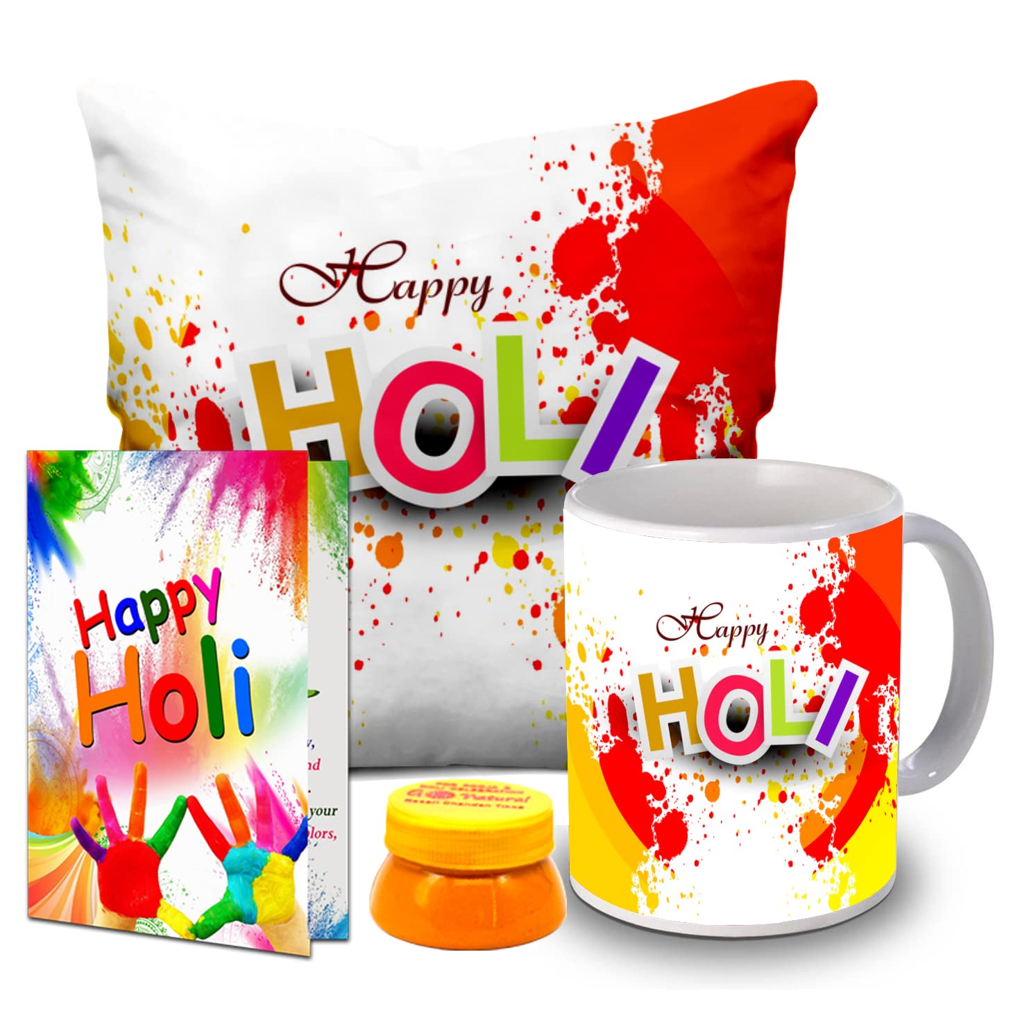 Celebrate Holi with love, happiness, and vibrant colors! The Printed Cushion, Coffee Mug, Greeting Card & Chandan Tilak gift set is the perfect way to spread festive joy and create cherished memories.