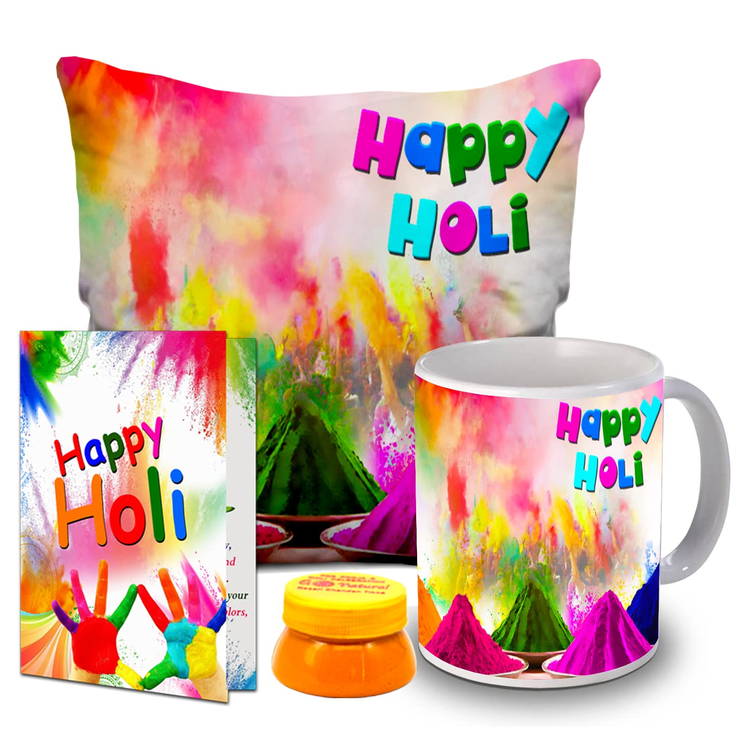 Celebrate the festival of colors with this vibrant and thoughtful Holi gift set that brings together comfort, festivity, and tradition. This beautifully curated set includes a Printed Cushion, Coffee Mug, Greeting Card, and Chandan Tilak, making it the perfect gift for spreading joy and warmth during Holi.