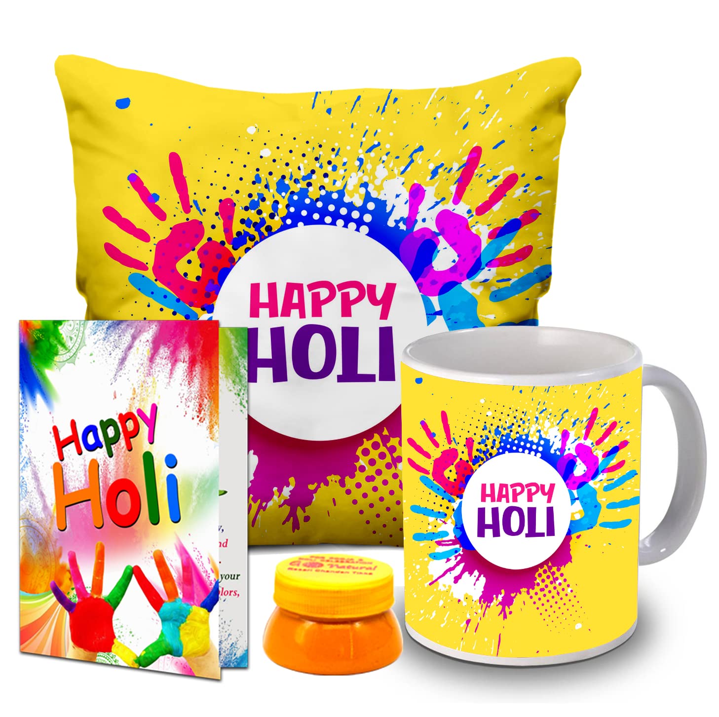 Celebrate Holi in a unique and meaningful way with our Printed Cushion, Printed Coffee Mug, Greeting Card & Chandan Tilak gift set. Perfect for spreading love, blessings, and joy this festive season!
