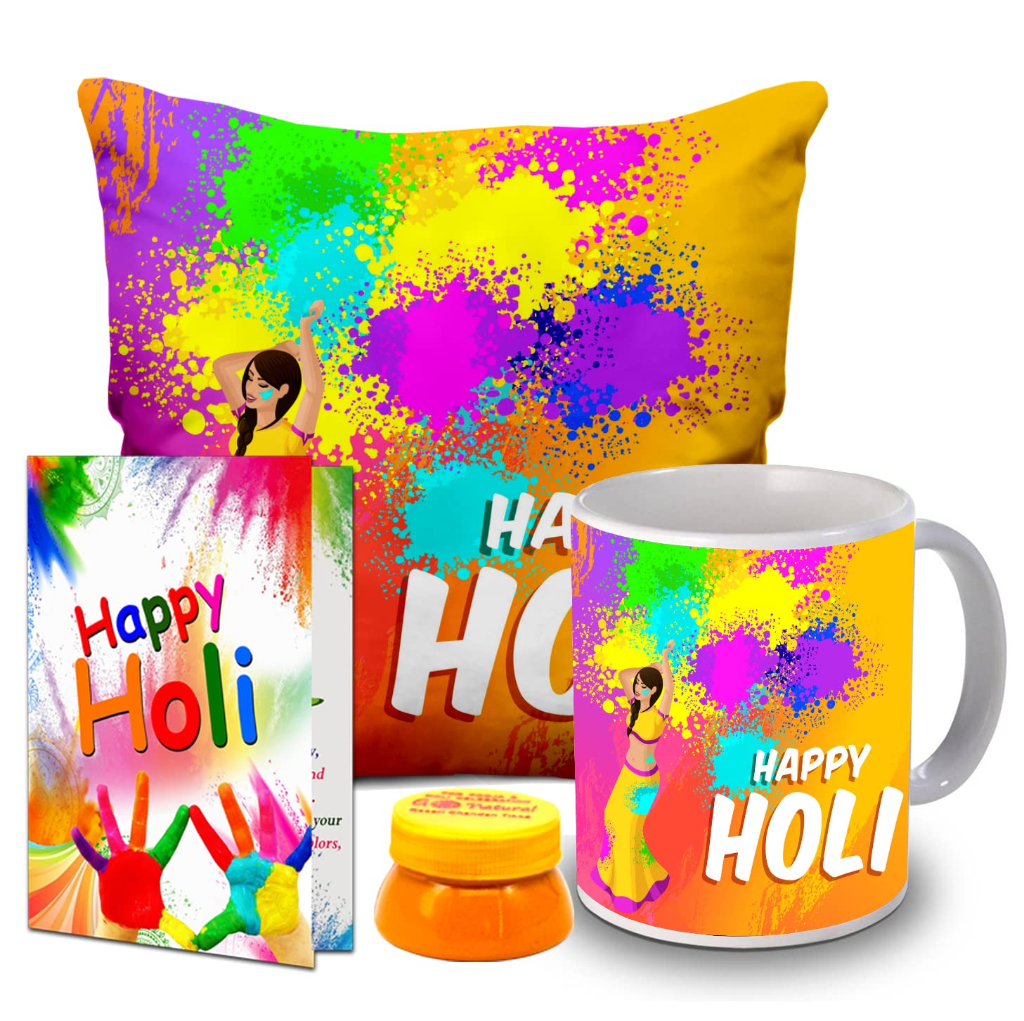 Looking for a meaningful and fun Holi gift? Our gift set offers just that! It combines comfort, color, and tradition, featuring a vibrant printed cushion, a festive coffee mug, a personalized greeting card, and Chandan Tilak, making it an unforgettable choice for the celebration of colors.
