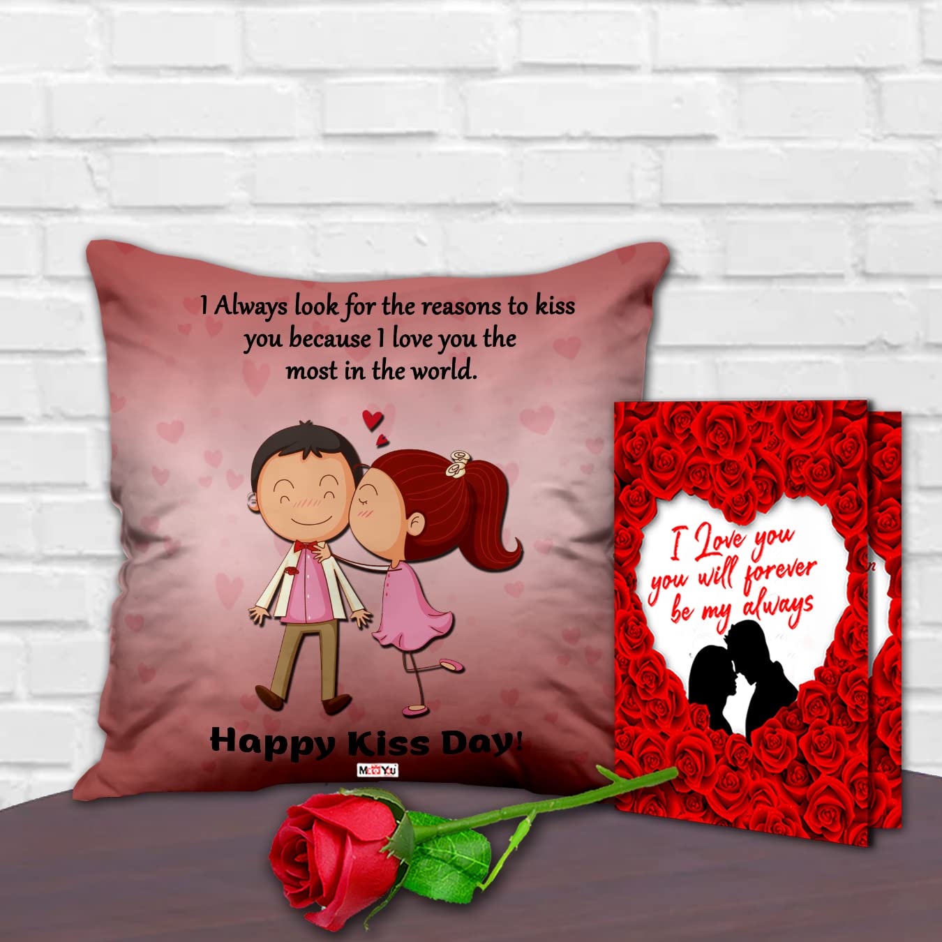 Together, the cushion, greeting card, and rose create a harmonious gift set that speaks volumes about love and affection. This set is not only perfect for Romantic Kiss Day, but also for any celebration of love, including anniversaries or a special moment shared between partners.