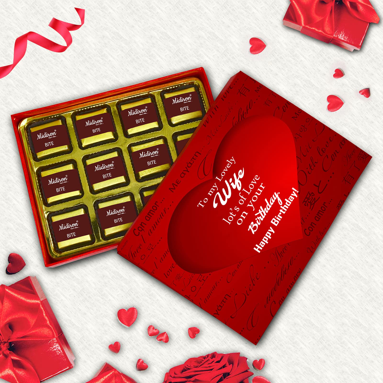 Midiron presents a Gift For Wife Birthday Special. A perfect combo for wife on the occasion of Birthday's gift. Gift it to your Wife, and feel your heart getting filled with the joy of smiles on their faces when they receive it. Birthdays come around but once a year. When a special person in your life has a birthday, sometimes it can be hard to know exactly what words will make the big day special so given this birthday gift to express your felling for your special one. Midiron Chocolates have unique secret recipes, driven by their unmatched standard for chocolate quality and their passion for creative excellence. They start with the selection of the finest raw materials and highest quality ingredients.