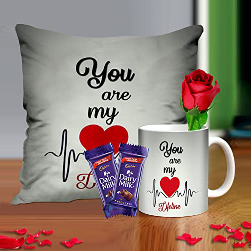 Make your girlfriend, wife, or spouse feel truly special with this romantic birthday gift set, designed to express your love and appreciation. This thoughtfully curated gift combo includes a microfiber filler cushion, a printed coffee mug, a beautiful artificial rose, and two Dairy Milk chocolates—everything she needs to feel cherished on her special day. Perfect for a birthday, anniversary, or simply to make her feel loved.