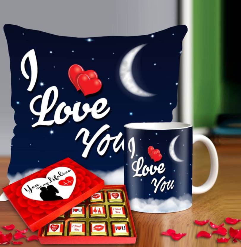 Contents: 3 items (Chocolates, Mug, Cushion)