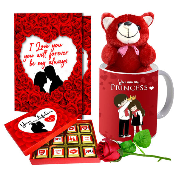 A Thoughtful Blend of Tradition and Modernity: Combining classic symbols of love like the red rose and chocolates with modern keepsakes like the coffee mug and teddy bear, this set is the perfect amalgamation of timeless romance and contemporary expression.