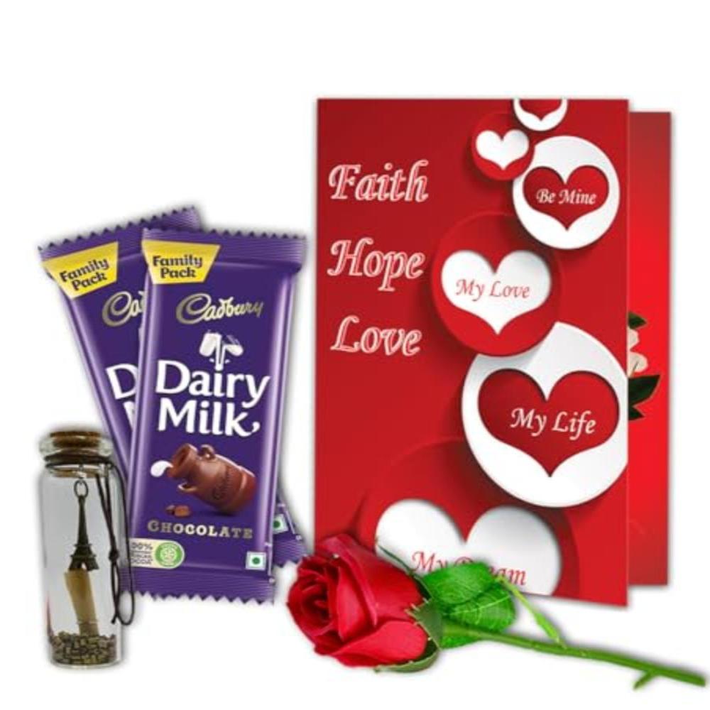 - PACKAGE CONTAINS -2 Dairy Milk Chocolates Bar (13.2 Gram Each) + 1 Artificial Rose + 1 Love Greeting Card + 1 Message Bottle