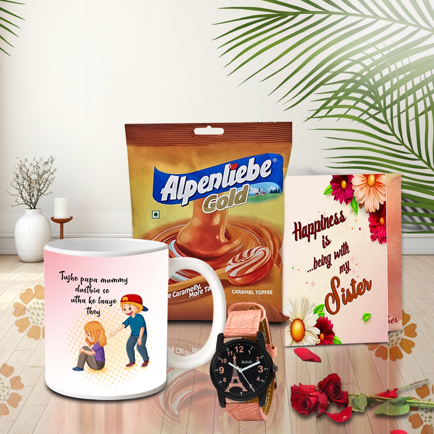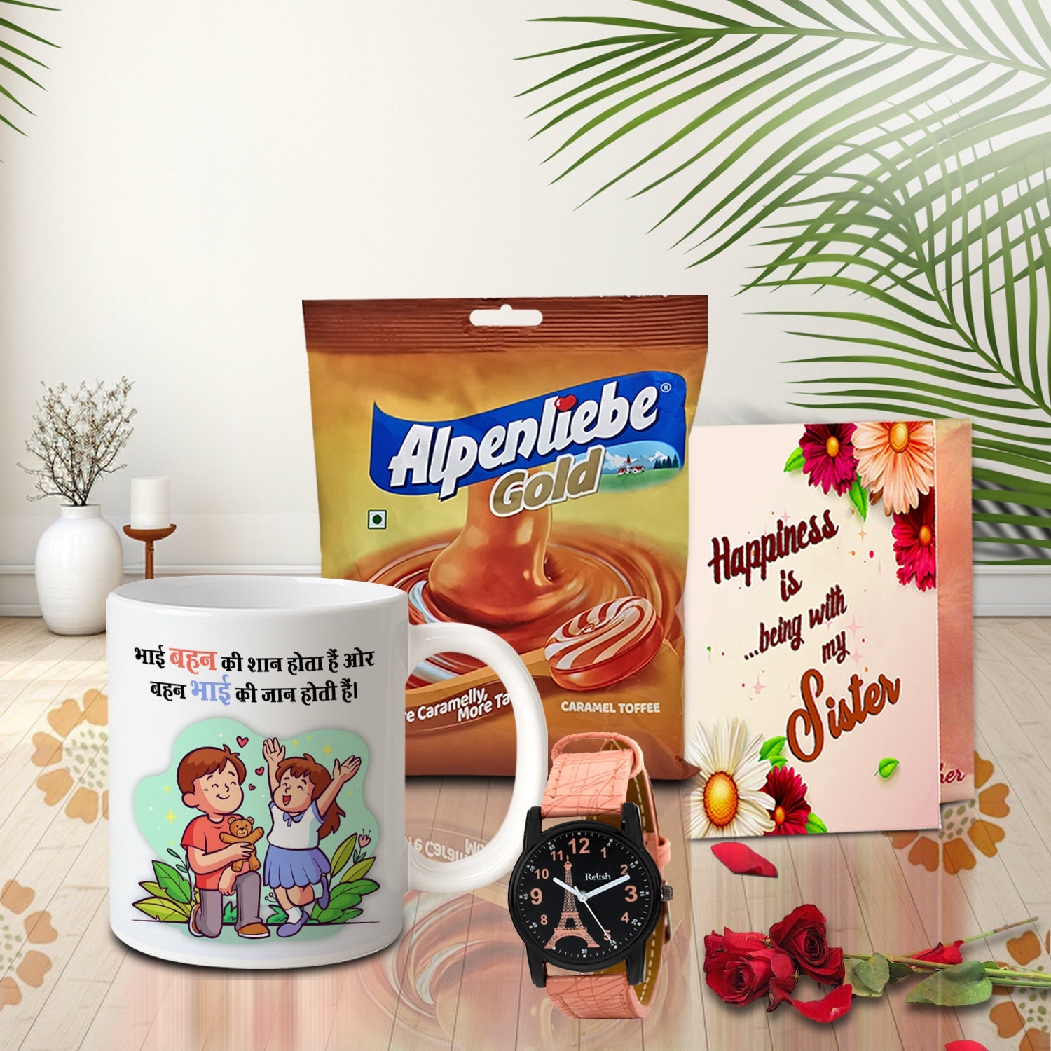 Introducing the “Time & Treats Rakhi Gift Set”—a heartwarming and thoughtful hamper created to reflect the unique love between siblings. Whether you’re near or far this Rakhi, this beautifully curated set ensures your feelings reach your sister in the most meaningful way. With a stylish analog watch, a designer coffee mug, a pouch of chocolate candies, and a sister greeting card, this gift set is the perfect blend of elegance, emotion, and everyday joy.