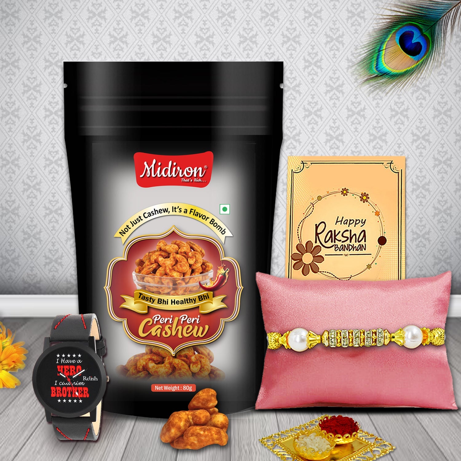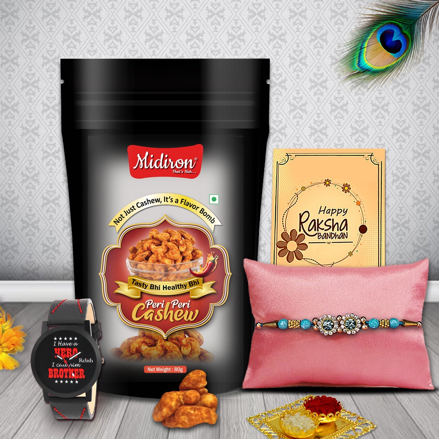 This Rakhi combo isn’t just a bundle of items—it’s a thoughtful celebration of everything Raksha Bandhan represents. From the timeless elegance of the watch to the heat of the peri peri cashews, from the sacred rakhi ritual to the personal note in the greeting card—every element has been selected with care. Whether your brother is near or far, younger or older, fun-loving or deeply spiritual—this gift will reach him as a reminder of your love and care. It’s modern, meaningful, and memorable.
