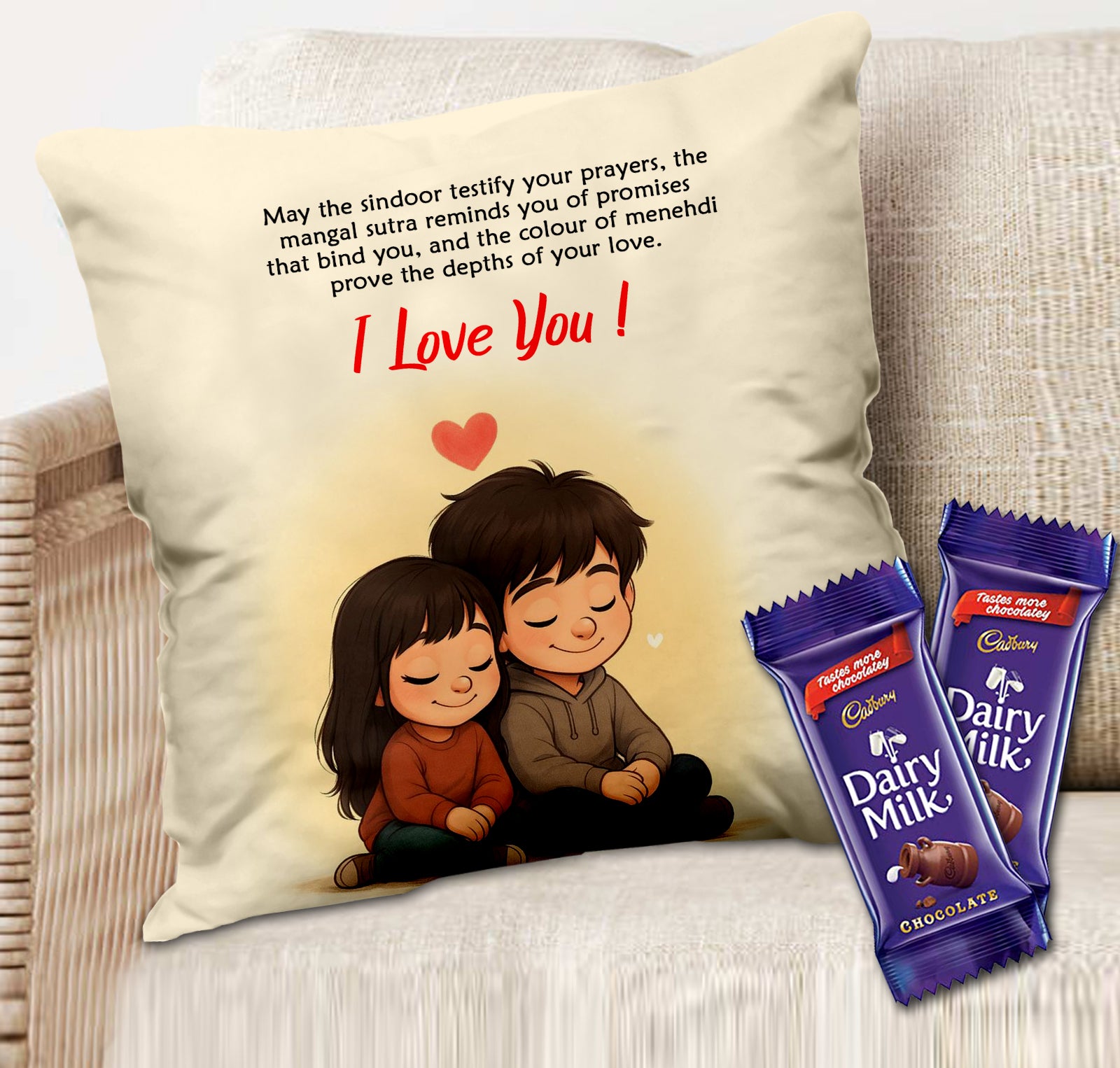 Celebrate the cherished bond of love and togetherness with a beautiful expression of affection—our Printed Cushion and 2 Chocolate Bar combo. Whether you're planning a sweet surprise for your beloved wife on Karwa Chauth or looking for a thoughtful gesture to make her smile, this gift combo is an ideal choice. A soft, stylish cushion printed with a romantic quote paired with two delicious chocolate bars is perfect to express love, warmth, and care.