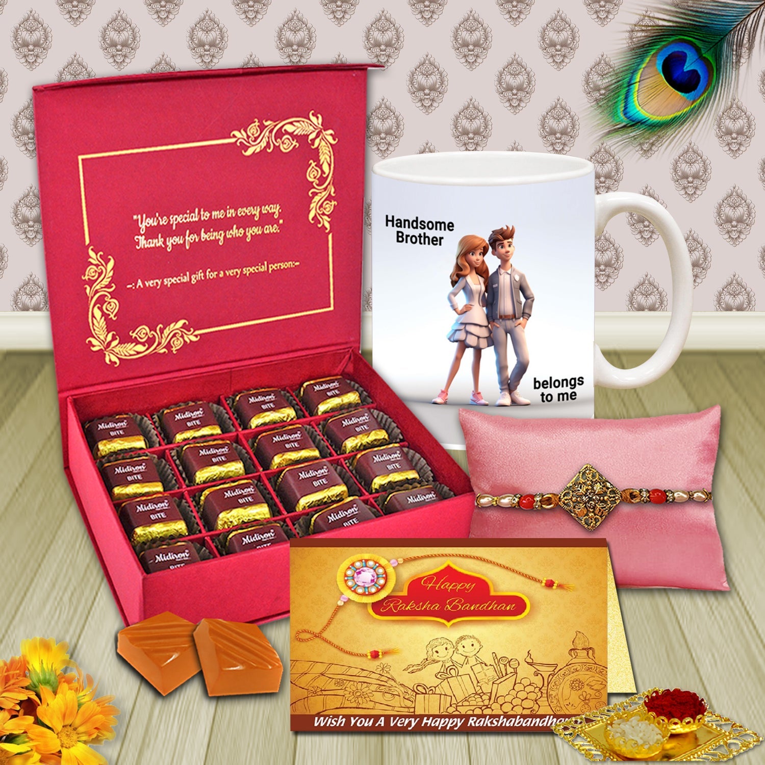 This Rakhi gift combo is compact yet deeply personal. It’s a celebration in a box—blending ritual, emotion, joy, and practicality into a single thoughtful hamper. Whether you're near or miles apart, this gift will make your brother feel cherished. Each element reflects the essence of Raksha Bandhan: tradition with the rakhi and roli chawal, emotion through the greeting card, sweetness with the chocolate box, and everyday warmth with the mug.