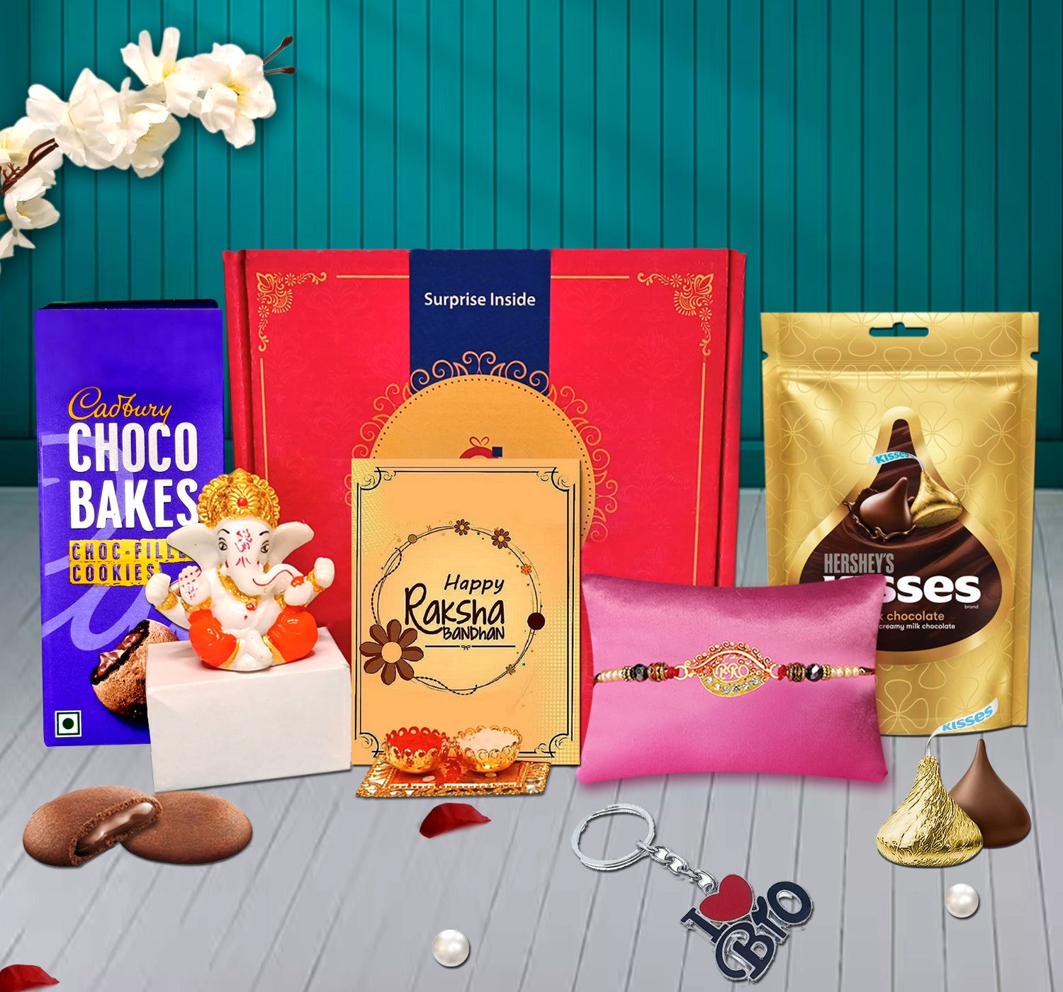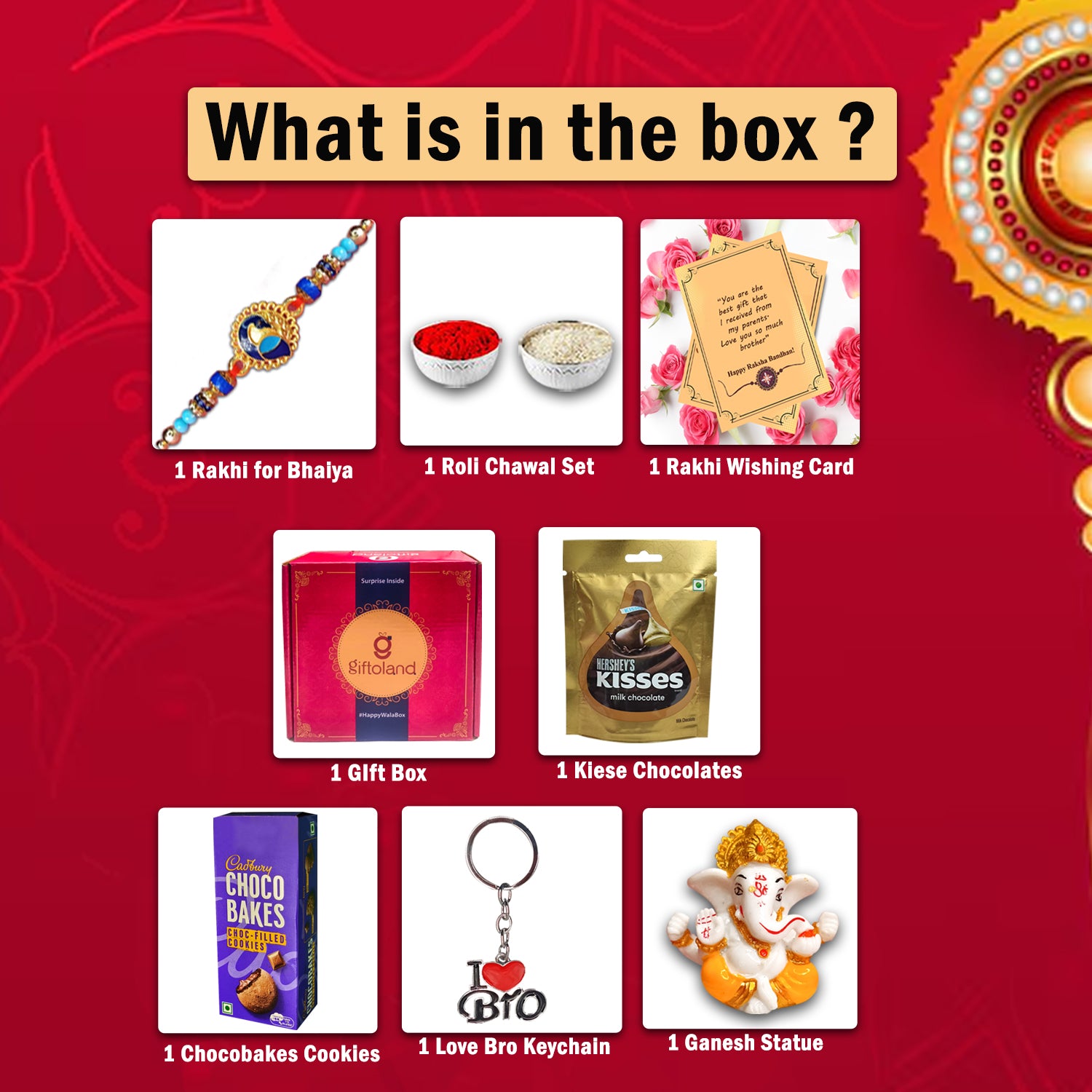 Chocolate Packet, Chocolate Cookies, Ganesh Idol, “I Love Bro” Keychain, 1 Designer Rakhi, Printed Rakhi Card, Roli and Chawal.