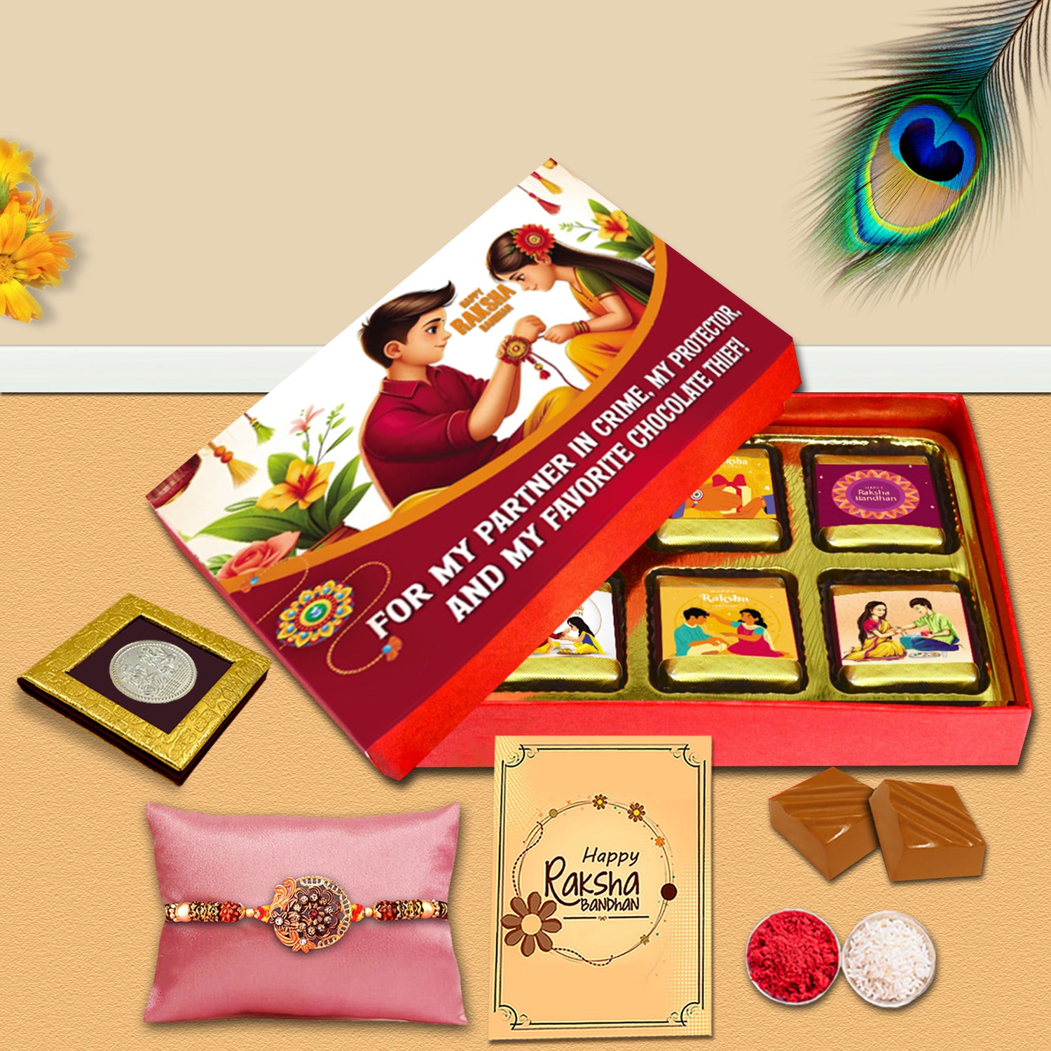 Celebrate the cherished bond between siblings with a Rakhi gift combo that blends tradition, blessings, and sweetness in the most heartwarming way. This thoughtfully curated set includes a premium chocolate box, an elegant Rakhi thread, a shining silver coin, a vibrant printed Rakhi card, and a roli-chawal pack to complete the sacred ritual.