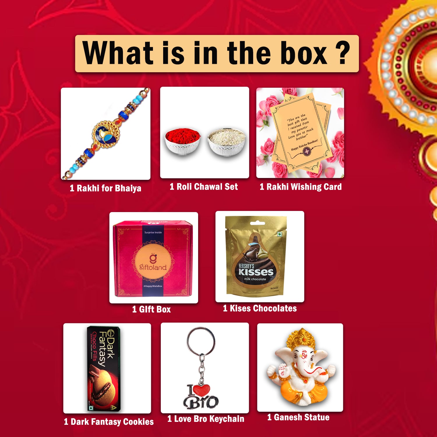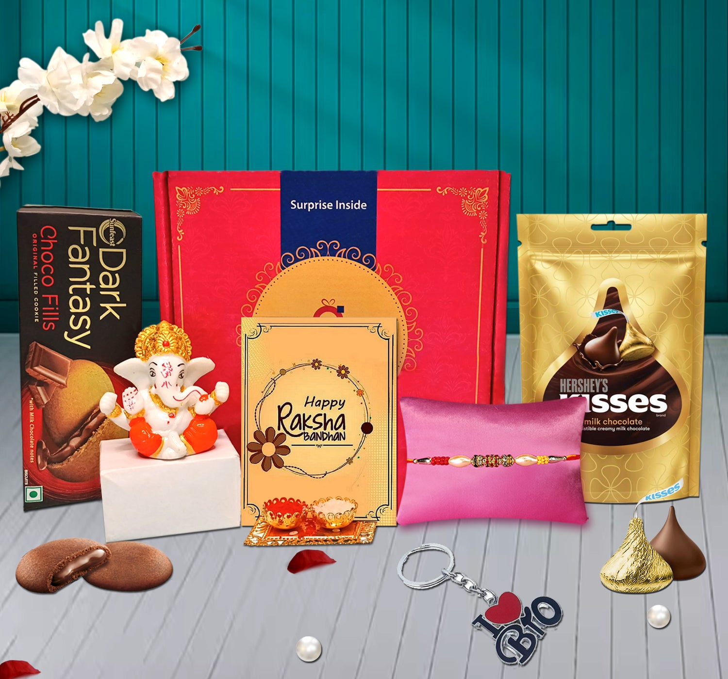 Whether your brother is emotional, spiritual, a foodie, or just someone who enjoys surprises, this hamper is ideal for every personality. The chocolates cater to his sweet tooth, the rakhi and roli chawal uphold the traditions, the Ganesh statue brings a divine touch, the keychain adds everyday utility, and the card conveys love in words—everything bundled into one perfect Raksha Bandhan gift.