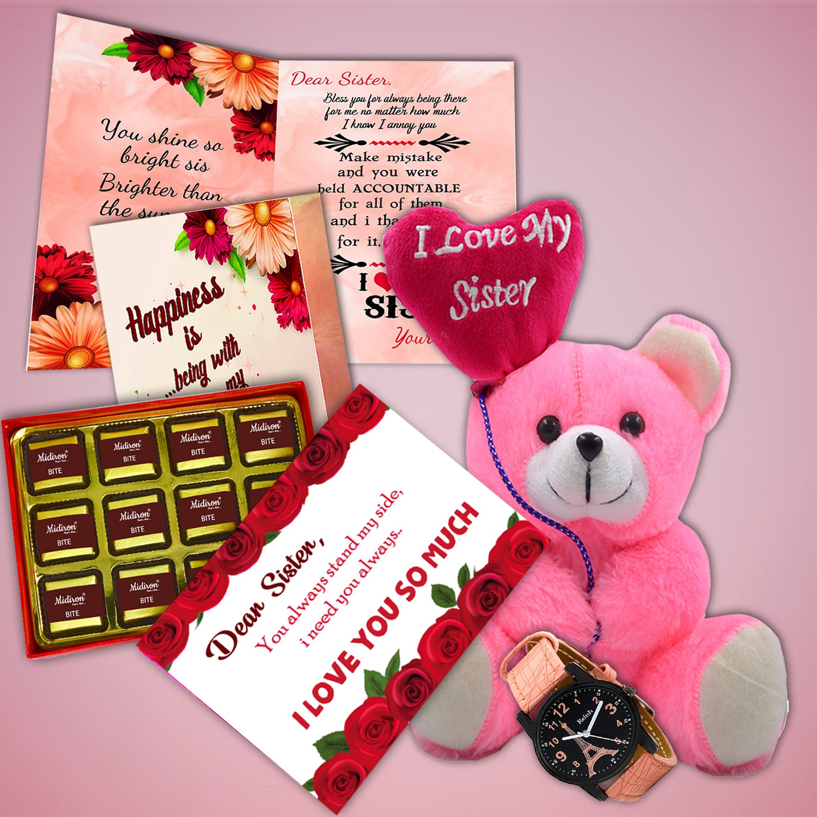 Celebrate the timeless bond of love and laughter with your sister this Raksha Bandhan by gifting her a thoughtfully designed combo featuring delicious chocolate, a cute teddy bear, a meaningful Raksha Bandhan card, and a trendy wristwatch. This charming gift set is perfect for brothers looking to surprise their sisters with something sweet, thoughtful, and practical—all in one elegant Rakhi hamper.
