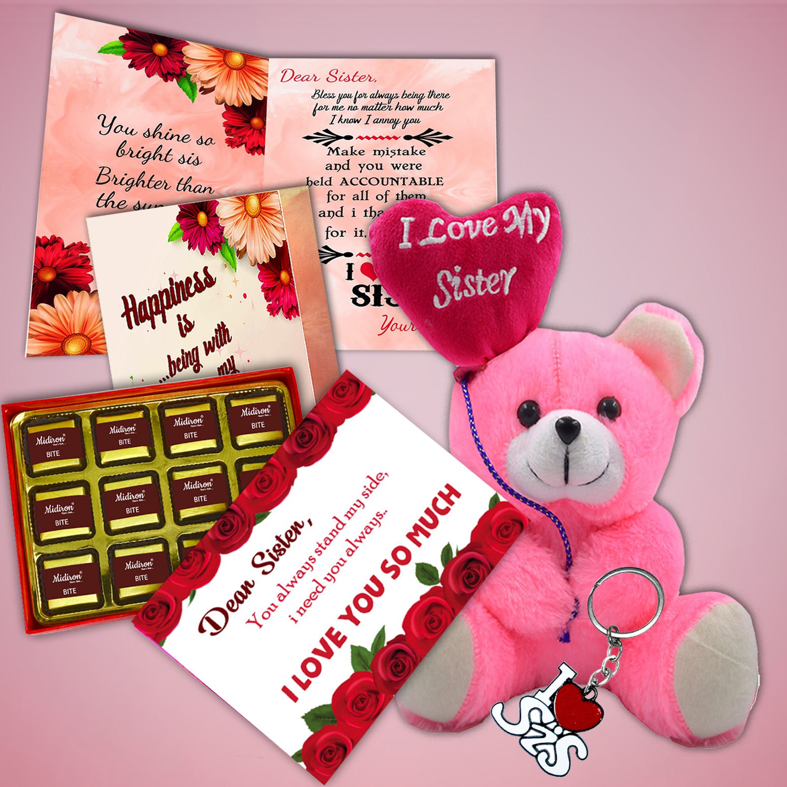 This Rakhi, give your sister more than just a gift—give her a moment. The teddy brings warmth, the chocolate brings joy, the card conveys emotion, and the keychain adds a modern touch. Together, they create a complete gift experience that will be remembered long after Raksha Bandhan is over.
