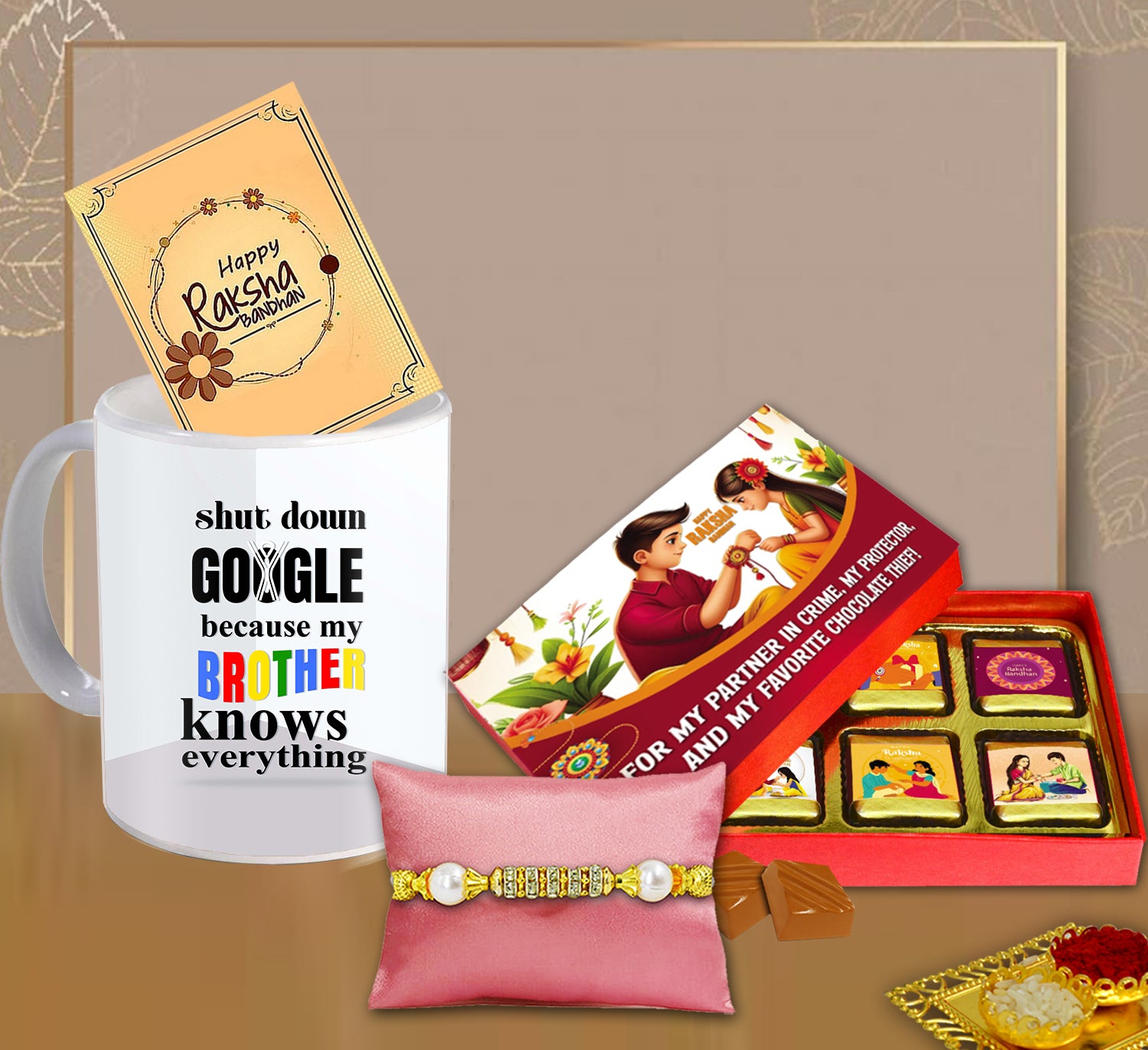 This Rakhi combo offers something for every side of the sibling bond. The chocolates add flavor, the mug brings utility and memory, the rakhi symbolizes protection, the card gives voice to your feelings, and the roli-chawal keeps the tradition intact. Ideal for brothers of all ages—whether you’re looking for a cute gesture for your younger sibling or a meaningful surprise for an elder one—this combo feels personal, festive, and full of heart.