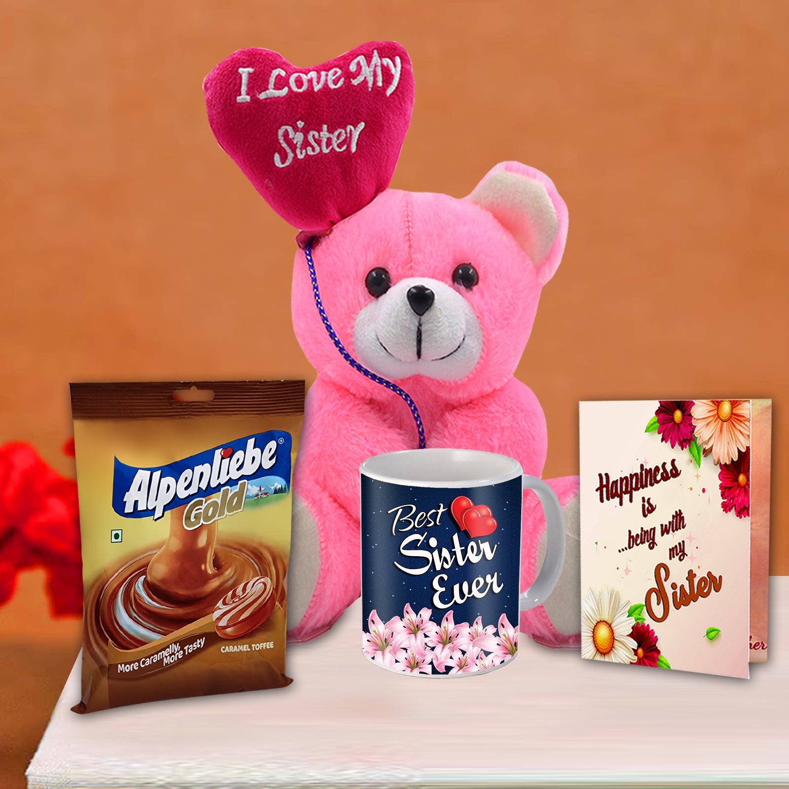 This Rakhi, go beyond the ordinary. Surprise your sister with a gift that says it all—without saying a word. Introducing the “Hugs & Happiness Rakhi Gift Set”, a thoughtfully curated hamper that brings together cuteness, sweetness, utility, and heartfelt emotion in one charming box. With an adorable ‘I Love Sister’ teddy bear, a printed coffee mug, a pouch of chocolate candies, and a sister greeting card, this gift hamper is perfect for telling your sister: “I may not say it every day, but you mean the world to me.”