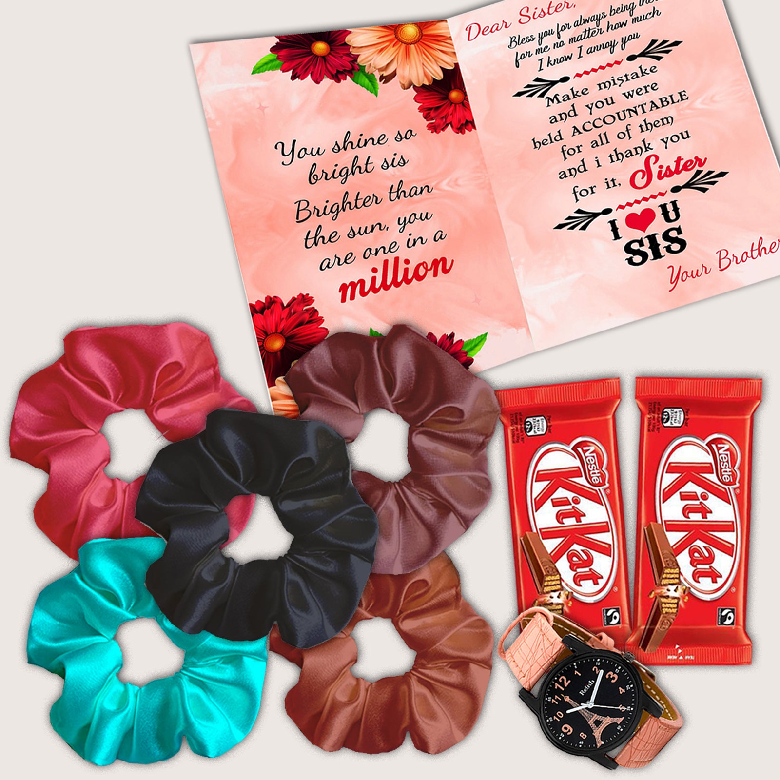 This combo is ideal for younger and teenage sisters who enjoy stylish, cute, and useful gifts. With everything from hair accessories to sweet treats, it delivers variety without being overwhelming. The watch adds value, the scrunchies and keychain add fun, and the card and chocolate bring in the festive spirit.