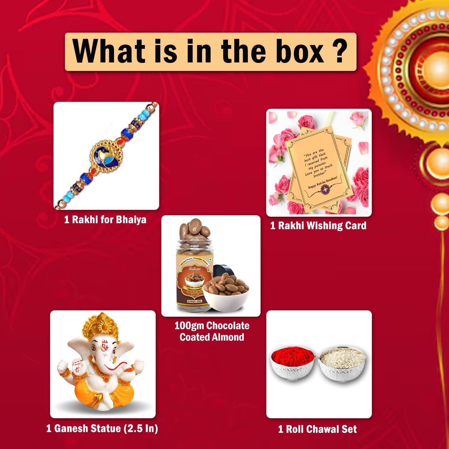 If you’re searching for rakhi gift hampers for brother or raksha bandhan gift ideas for brother that include both tradition and modern favorites, this one checks every box. From the richness of chocolate almonds to the auspicious presence of Lord Ganesha, it’s crafted to delight the heart and soul.