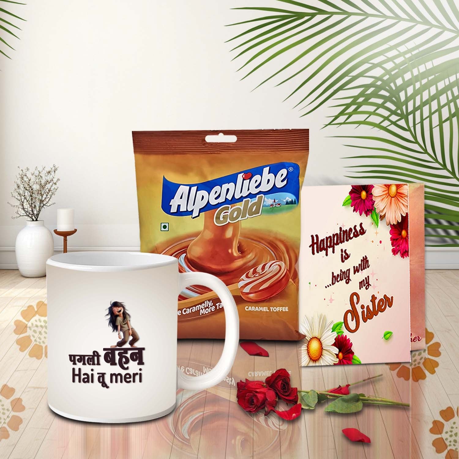 Introducing the “Sweet Sips & Sisterhood Rakhi Gift Set”—a thoughtfully curated gift that reflects the warmth and affection between siblings. Whether you're celebrating across the dining table or across time zones, this gift makes sure your love reaches her heart. With a stylish designer printed coffee mug, a pouch of delicious chocolate candies, and a heartfelt greeting card, this gift set wraps emotions into every element—making it the perfect Rakhi surprise for your sister.