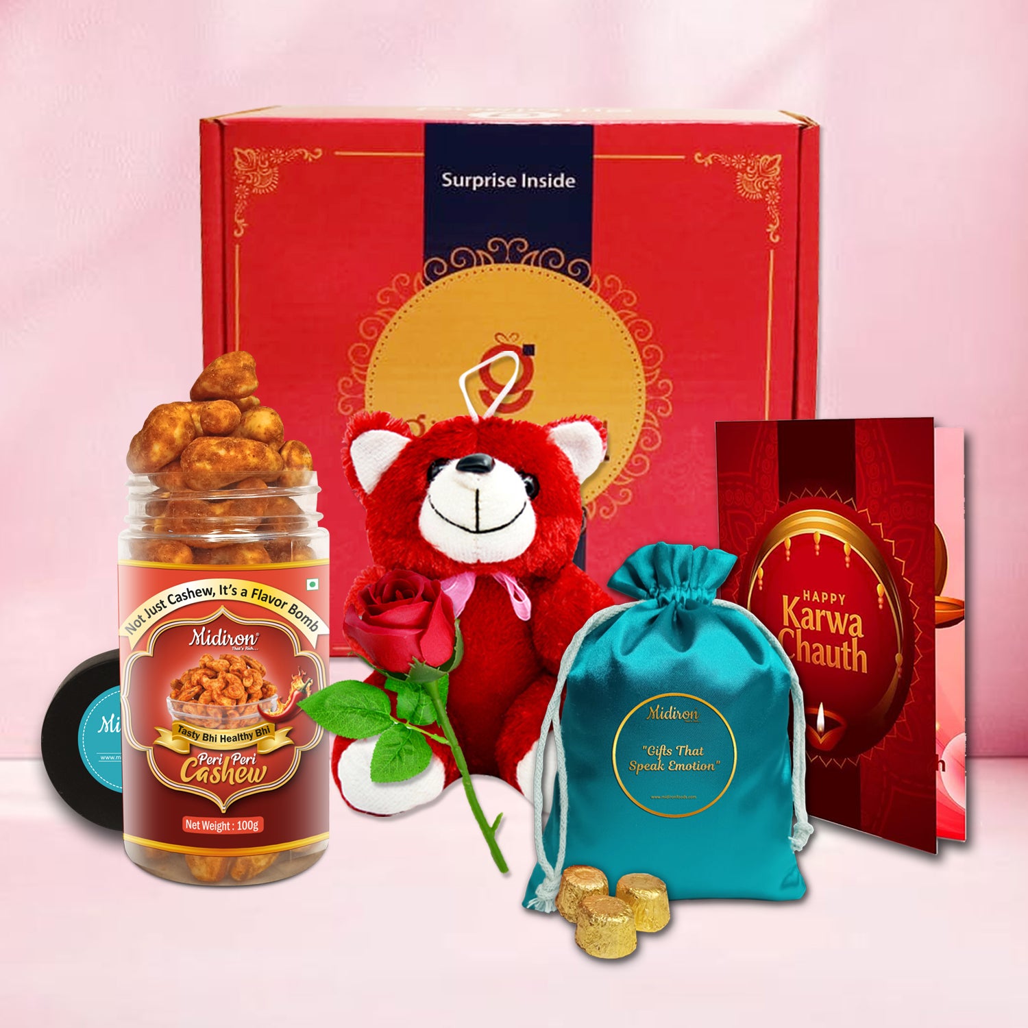 Celebrate the essence of devotion, togetherness, and heartfelt emotions this Karwa Chauth with a gift combo that balances spice, sweetness, love, and elegance. This specially curated Karwa Chauth gift hamper is crafted for couples who love to express their feelings with thoughtful gestures. It includes Peri Peri Masala Cashew for a fiery twist, an “I Love You” teddy for emotional warmth, a festive chocolate thaili for sweetness, a printed Karwa Chauth card for heartfelt words, and a timeless watch to mark special moments. Whether you're celebrating your first Karwa Chauth or many years of togetherness, this combo beautifully reflects the love and respect shared between partners.