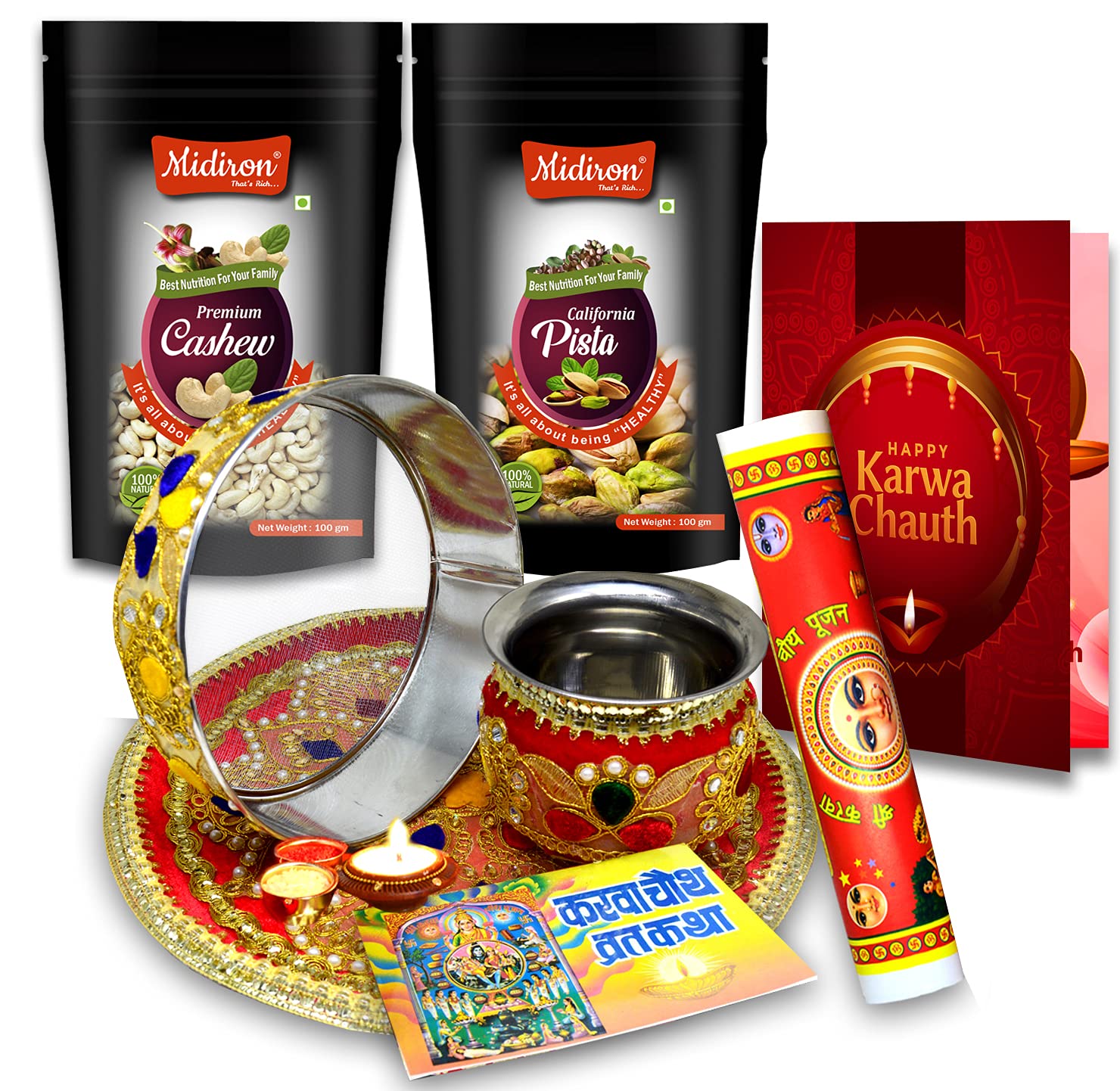 Make this Karwa Chauth extra meaningful with a thoughtful gift that blends devotion, tradition, and taste. This beautifully packed Karwa Chauth Pooja Thali Set includes all the essentials to perform the rituals with grace, along with 100 grams of premium cashew nuts, 100 grams of crunchy pista, and a Karwa Chauth printed greeting card to express heartfelt wishes.