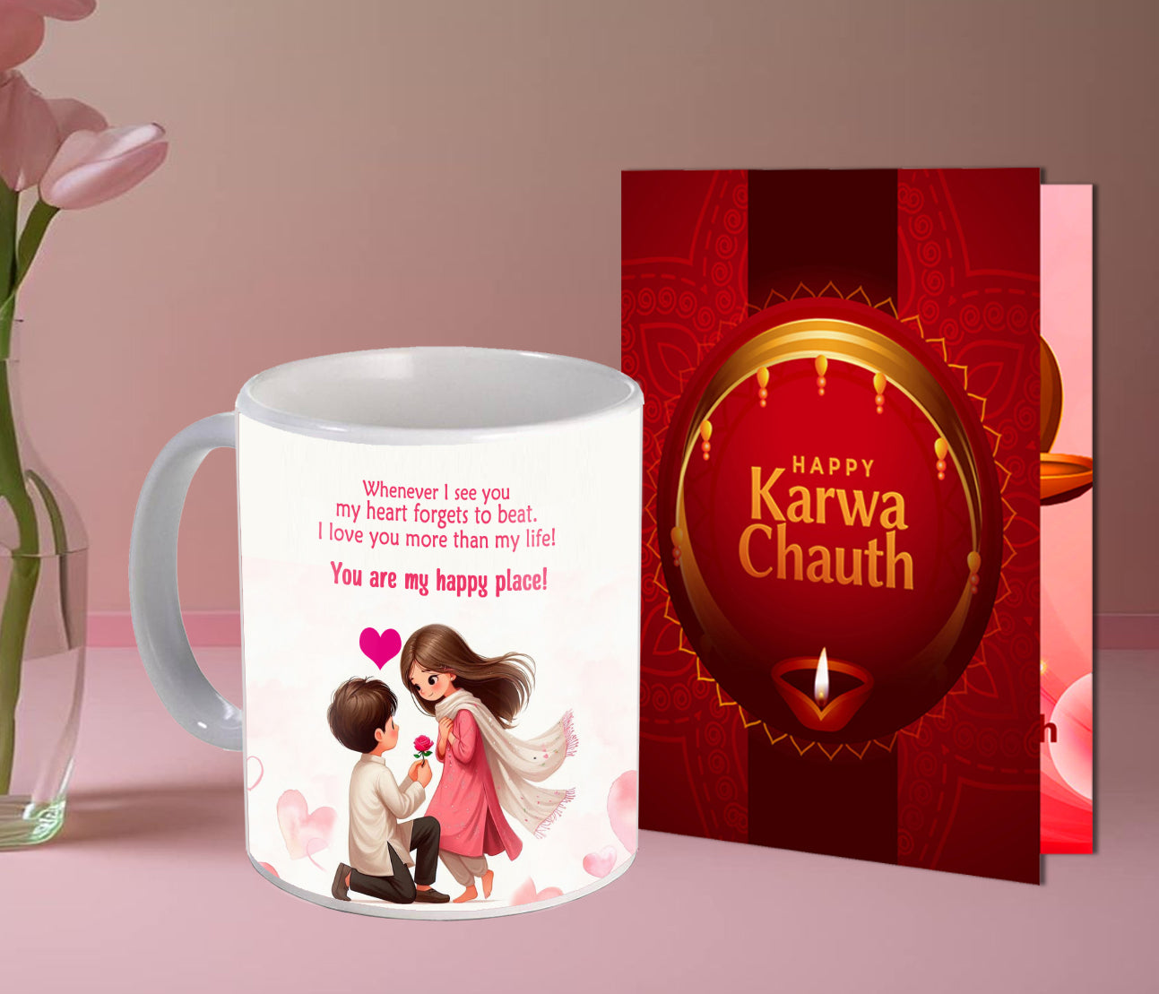 This thoughtful pairing brings together two essential elements of gifting—something to cherish and something to use. The Printed Coffee Mug enhances the daily routine, while the Karwa Chauth Greeting Card speaks directly to the heart.