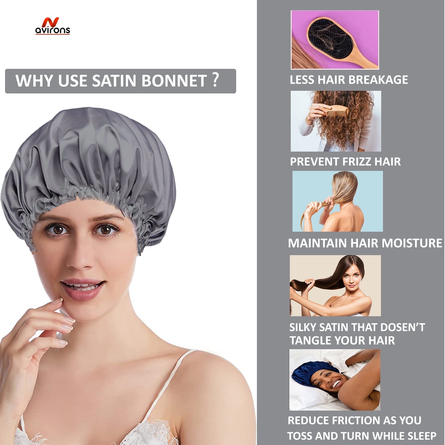 1. Hair Protection: The smooth satin silk fabric reduces friction on your hair while you sleep, minimizing breakage and split ends. This helps maintain your hair’s health and integrity.