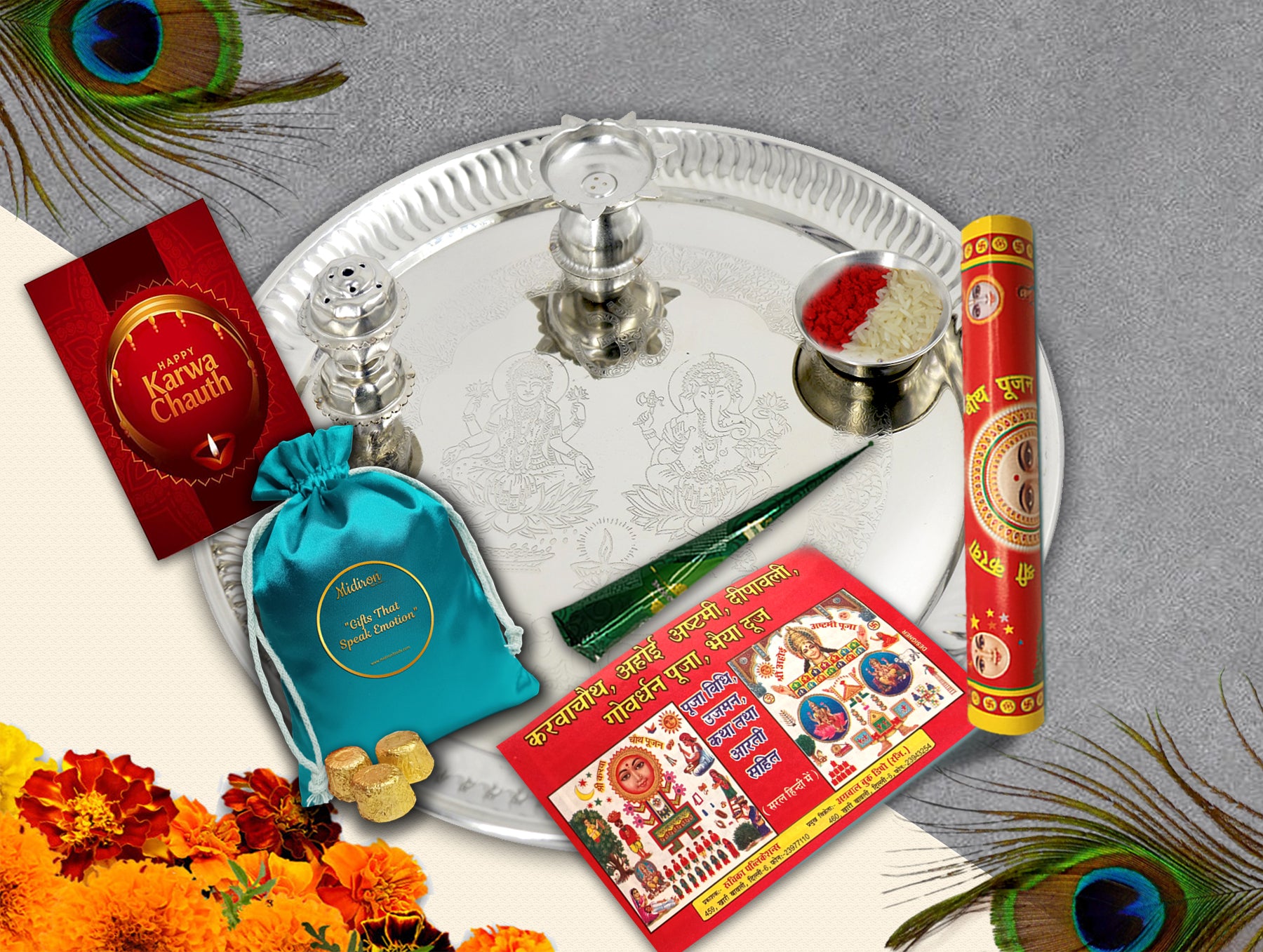 Every Karwa Chauth vrat begins and ends with prayer, and no puja is complete without the essentials. This combo includes a neat and traditional roli chawal pack, used during the evening ritual to perform aarti and apply tilak. The presence of these sacred elements reflects attention to tradition and ensures the fast is observed in the most respectful and complete way. This roli chawal for Karwa Chauth puja is hygienically packed and ready for use, making your festive preparations easier.