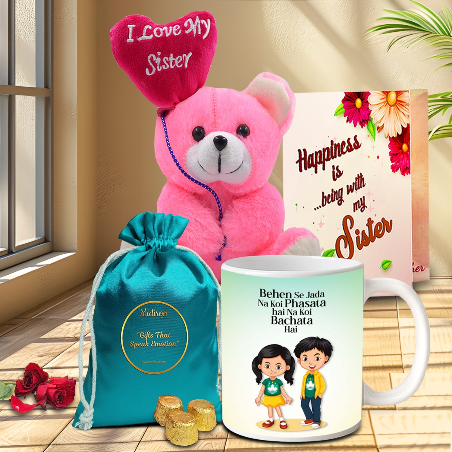 Raksha Bandhan is a beautiful reminder of the unbreakable bond between siblings—a day wrapped in memories, laughter, and promises. This year, make your sister feel as loved and appreciated as she truly is with a carefully curated gift that says it all, without saying a word. This Rakhi gift set is crafted to bring a smile to her face and warmth to her heart. It features a charming "I Love My Sister" teddy bear, a printed coffee mug, a pouch of delectable chocolates, and a heartfelt sister greeting card. Every item in this box is chosen with care, designed to evoke joy, nostalgia, and connection.
