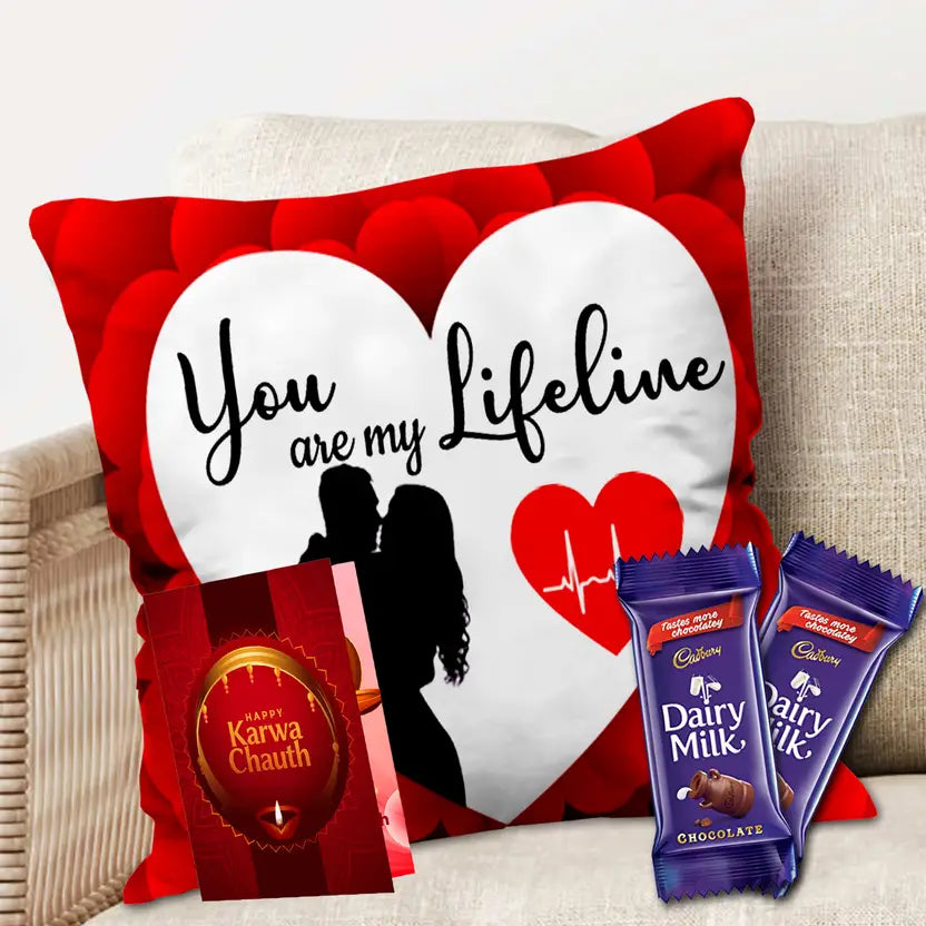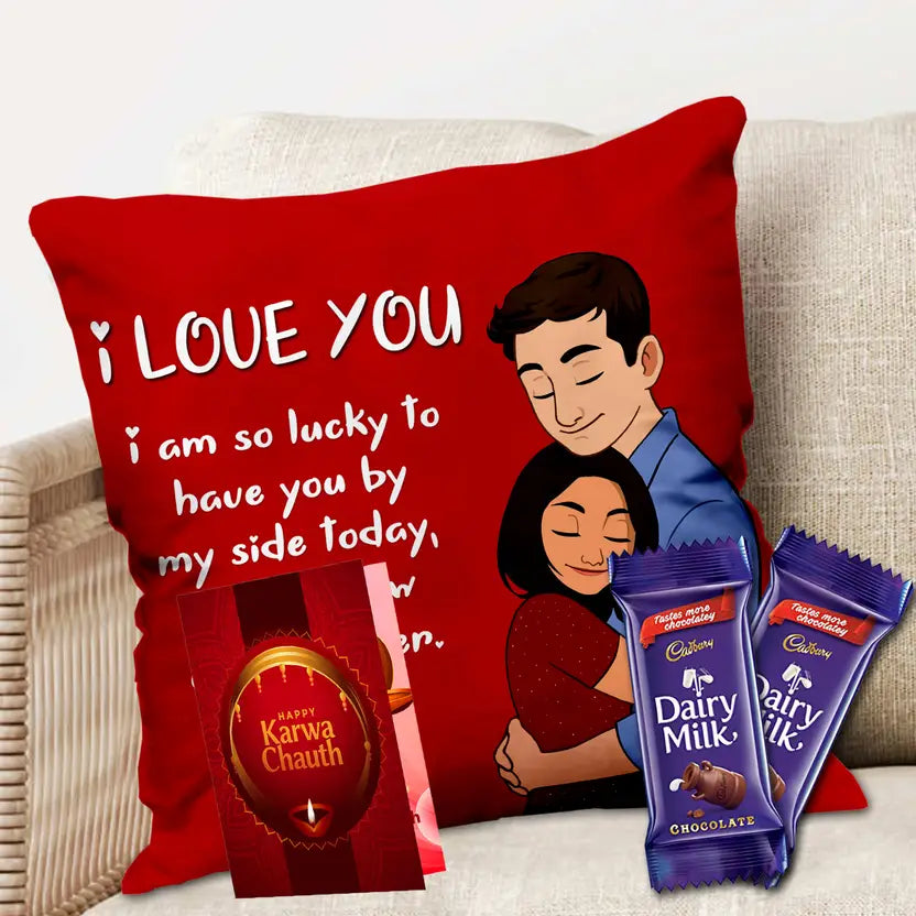 Celebrate the essence of Karwa Chauth by gifting a thoughtful combo that blends tradition with tenderness. This beautiful gift set includes a Karwa Chauth-themed printed cushion, two tasty chocolate bars, and a charming Karwa Chauth printed message card—an ideal surprise for your wife or fiancée who fasts with devotion and love.