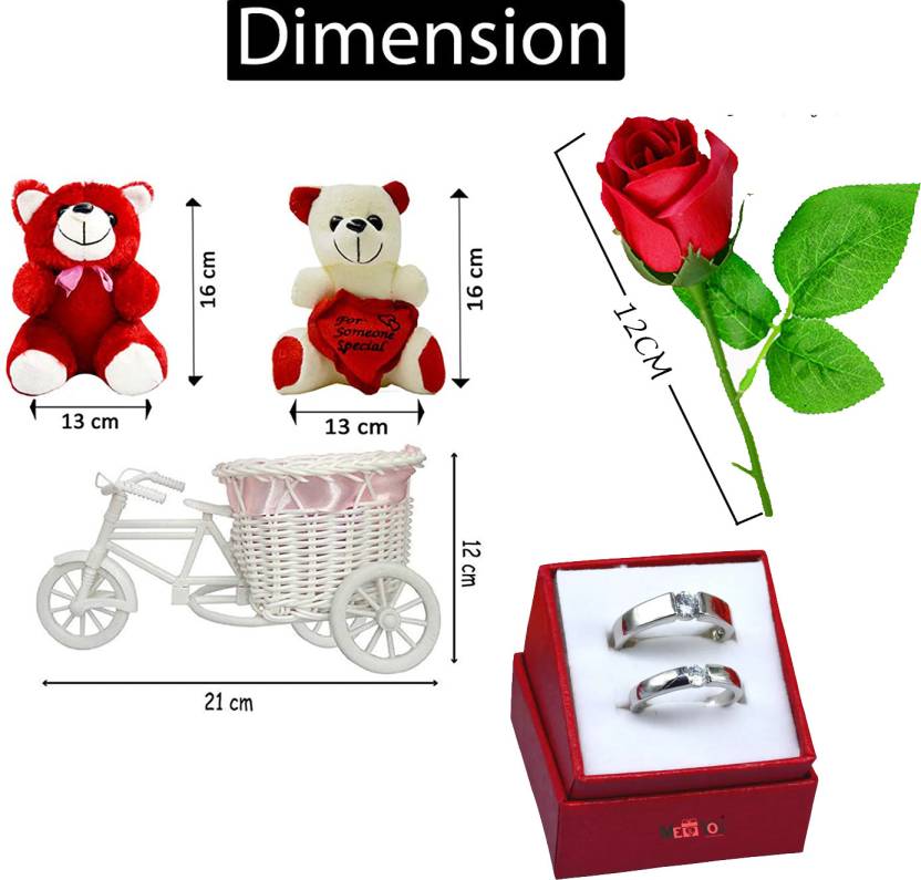 This Love Gift Hamper is designed for express your feeling to your partner on Valentine's Day, Anniversary, Birthday, New Year, Friendship Day & Ideal for 7 Days of Valentine's Week - Rose Day, Propose Day, Chocolate Day, Teddy Day, Promise Day, Hug Day, Kiss Day, or any Special Love Day of your life. This will make their heart happy because this radiates love, passion and romance. This combo Gift set will surely bring a smile on their face and, they shall cherish the beautiful moment of memories for years to come. This gift set is ideal for : Romantic Gift for Boys, Men, Boyfriend, He, Lover, Him, Husband, Hubby, Spouse, Fiance, Couple, Father, Brother. This love gift pack includes : 1 (I Love You) Greeting Card with lovely wishes for your Special ones (A greeting card expresses all the human emotions, joy, thanks, sympathy, humor, love and admiration. It allows us to connect on an emotional level with the people who have touched our lives), 2 Teddy (Red & White) with Cycle,1 Artificial Rose, 1 Couple Ring.